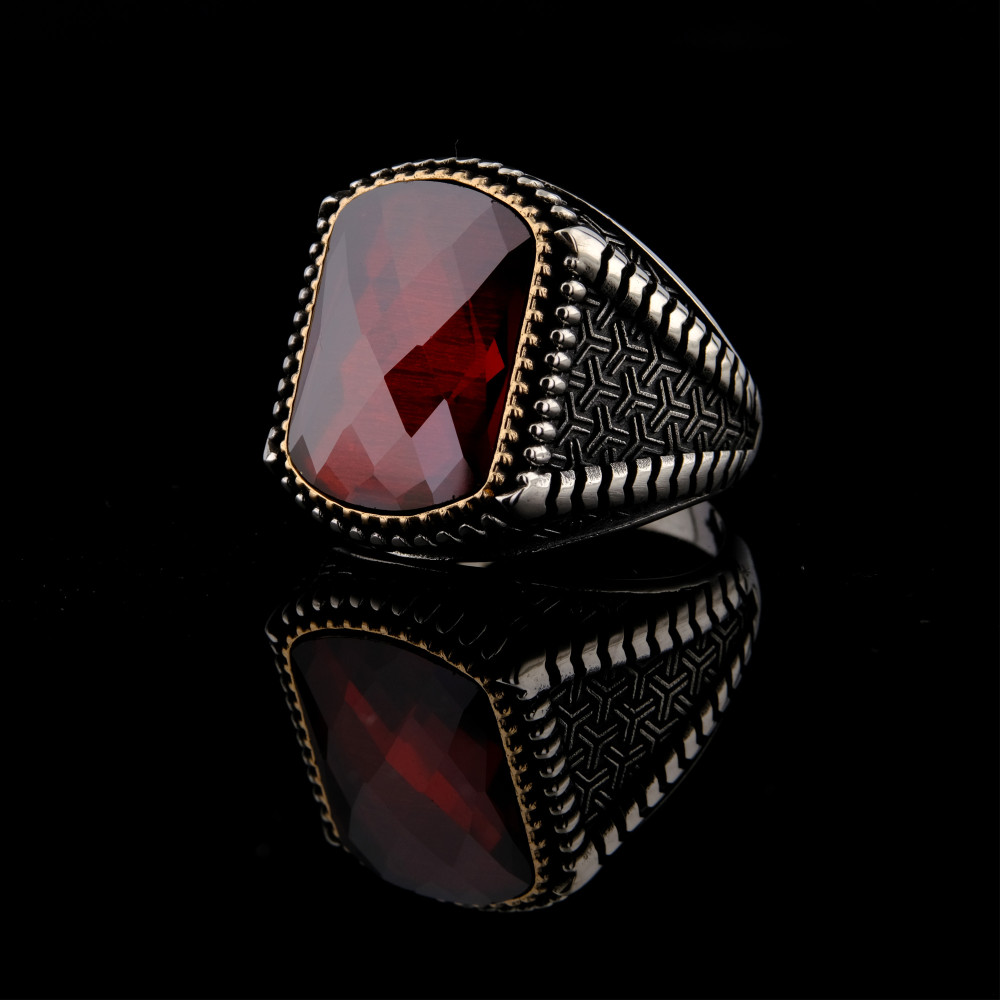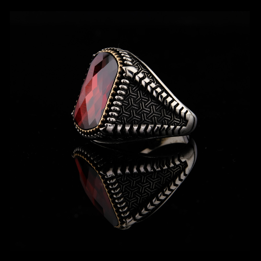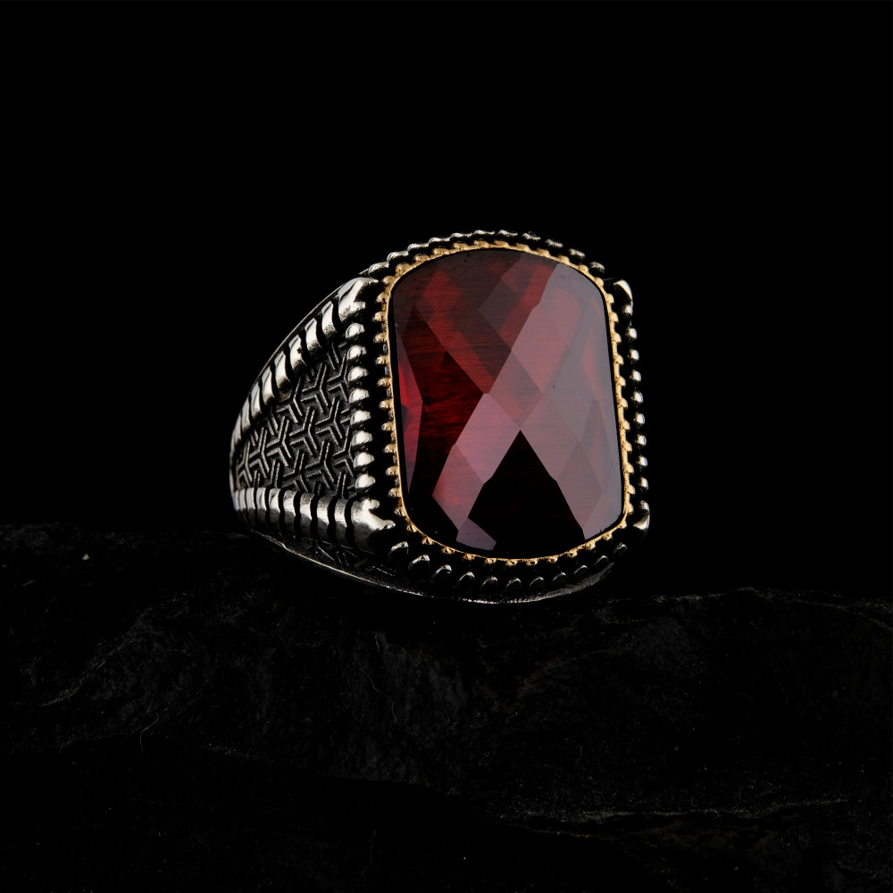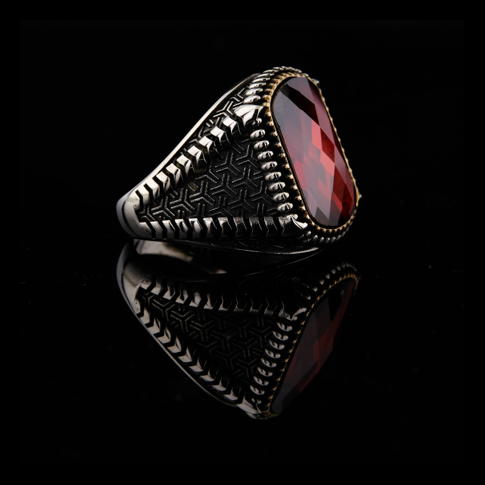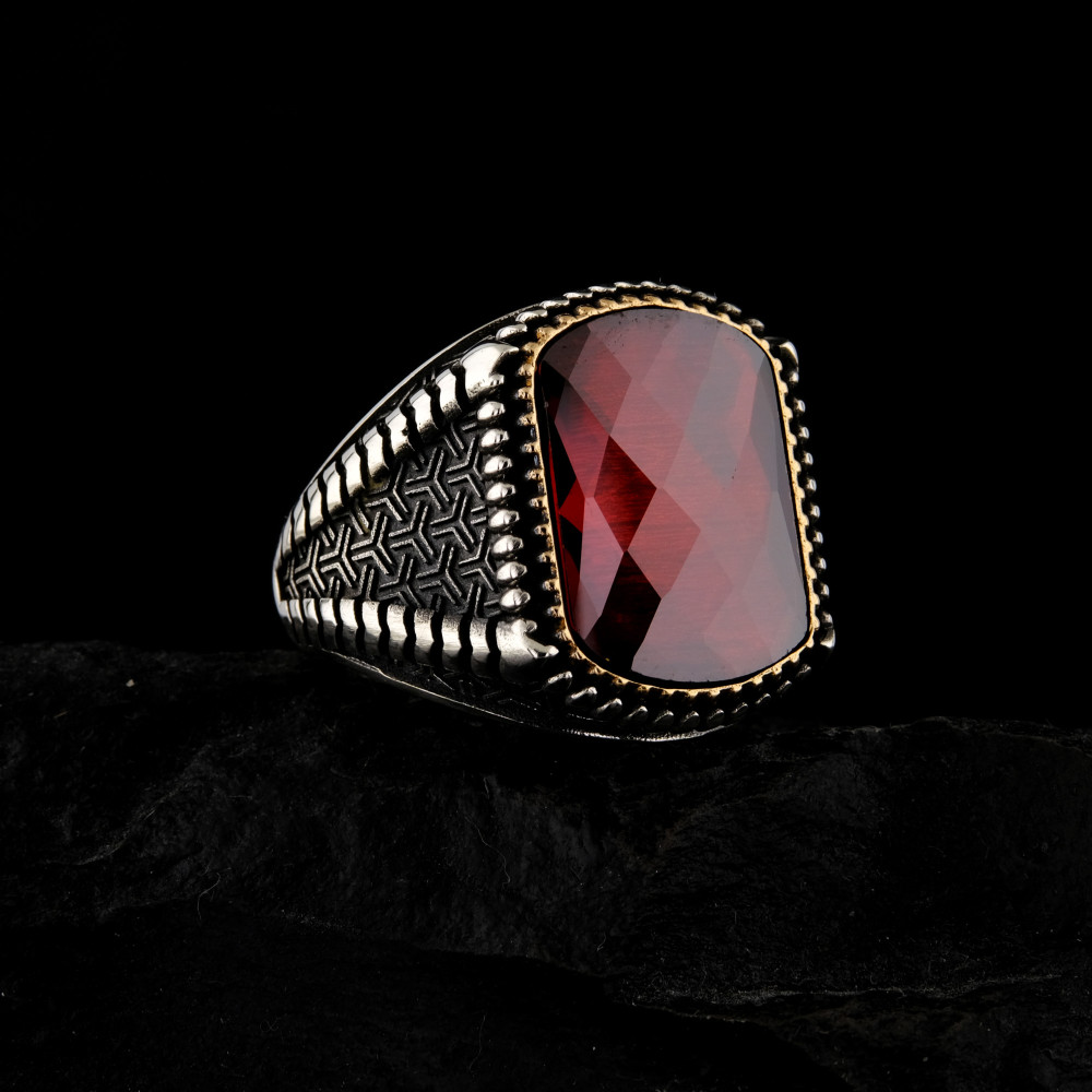 925 Ayar Gümüş Kırmızı Faset Kesim Taşlı Erkek Yüzük | El İşçiliği Özel Tasarım