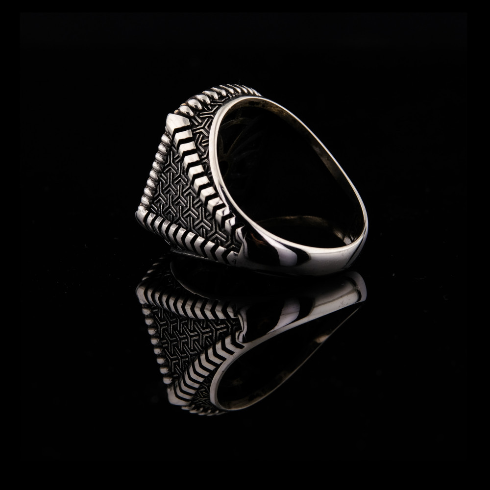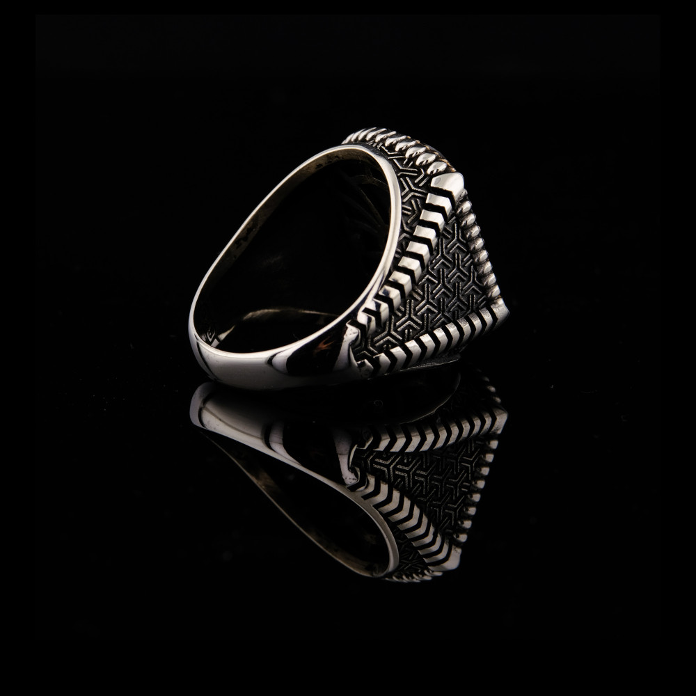 925 ayar gümüşten el işçiliği ile üretilmiş kırmızı faset kesim taşlı erkek yüzük, şıklığı ve karizmatik görünümü bir arada sunuyor. Göz alıcı kırmızı taş, parlaklığıyla dikkat çekerken, yan kısımlardaki geometrik desen işçiliği yüzüğe zarif bir detay katıyor.