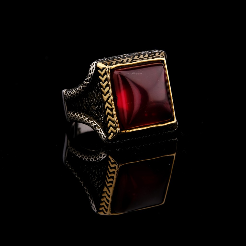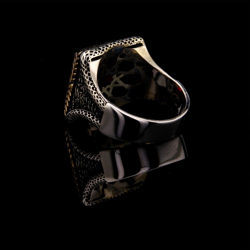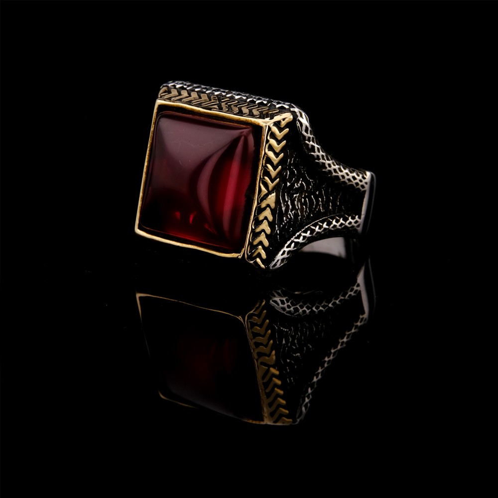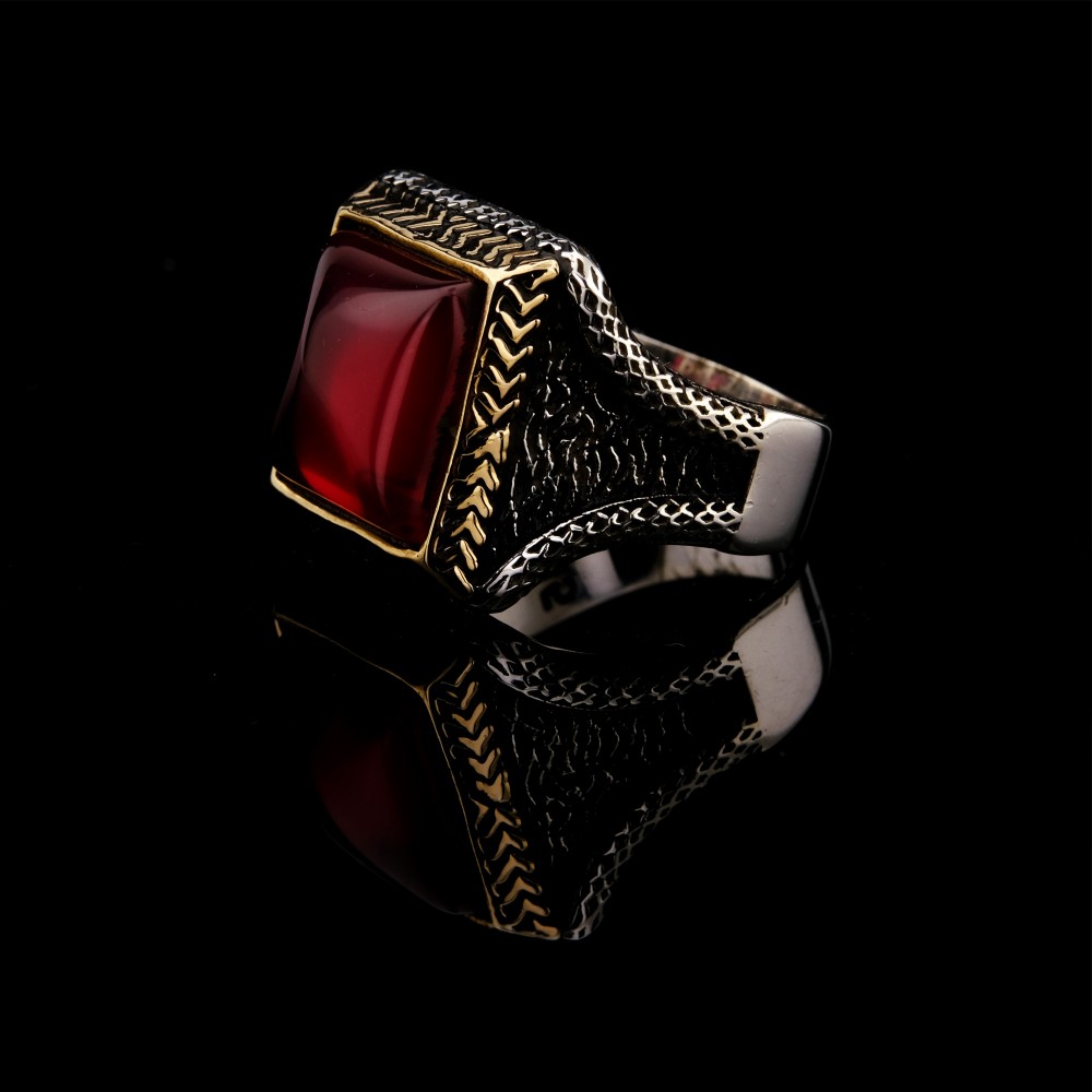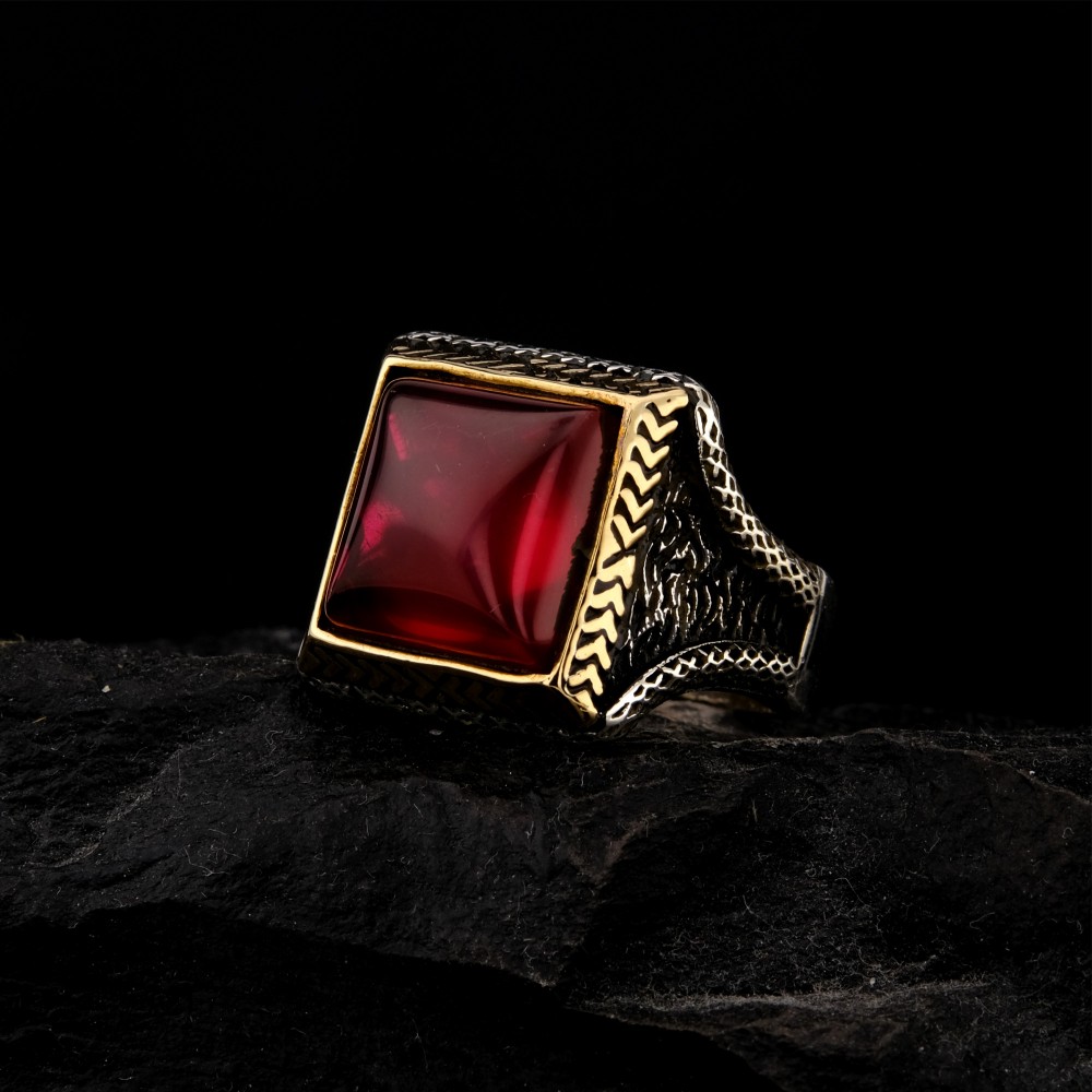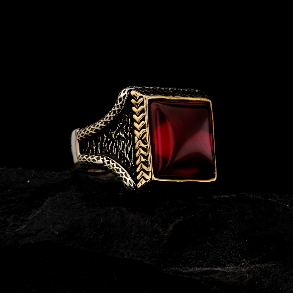 925 Ayar Gümüş Kırmızı Taşlı Başak Desenli Erkek Yüzük