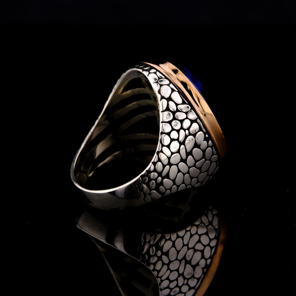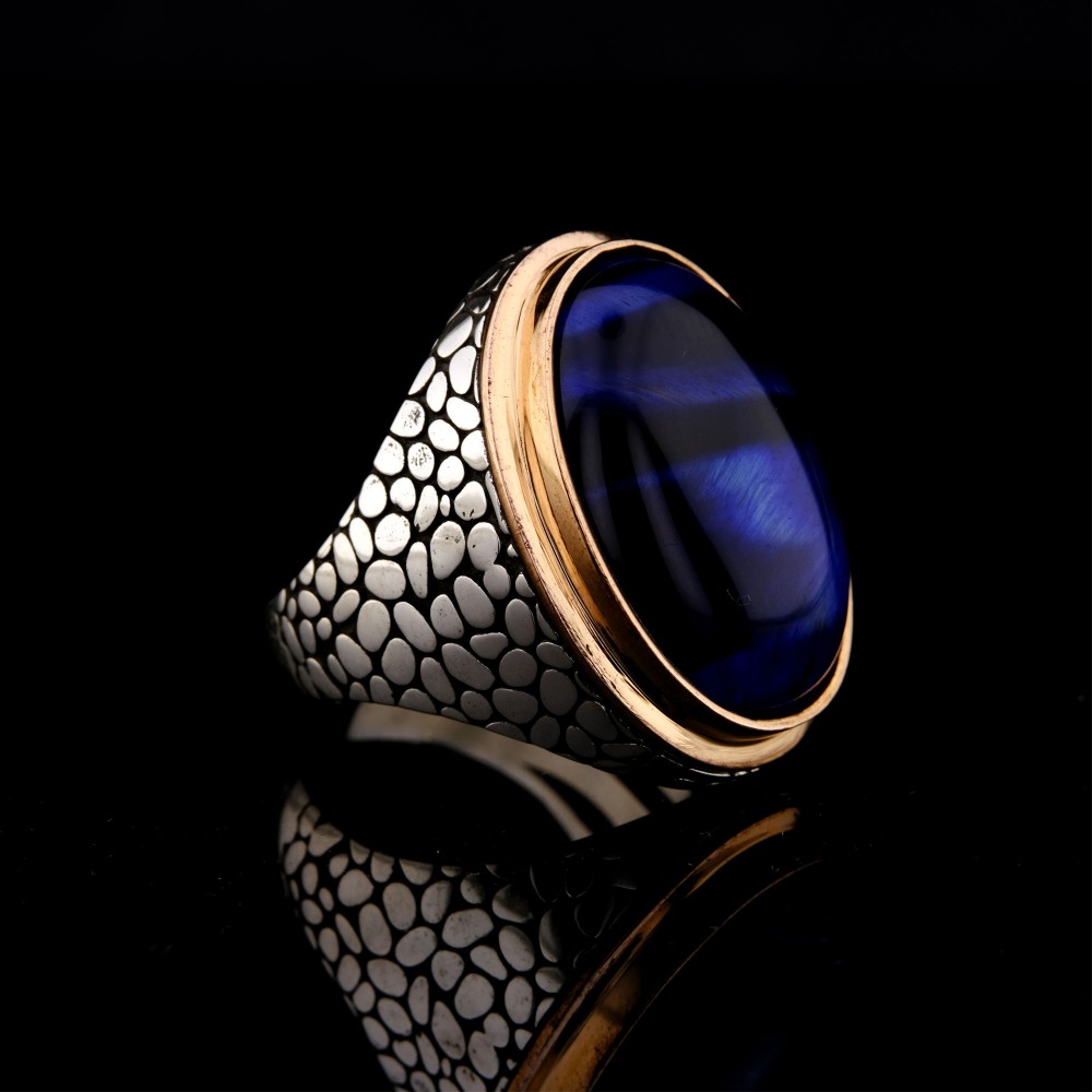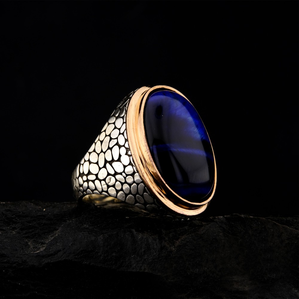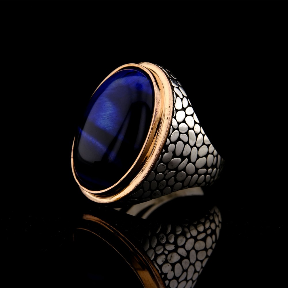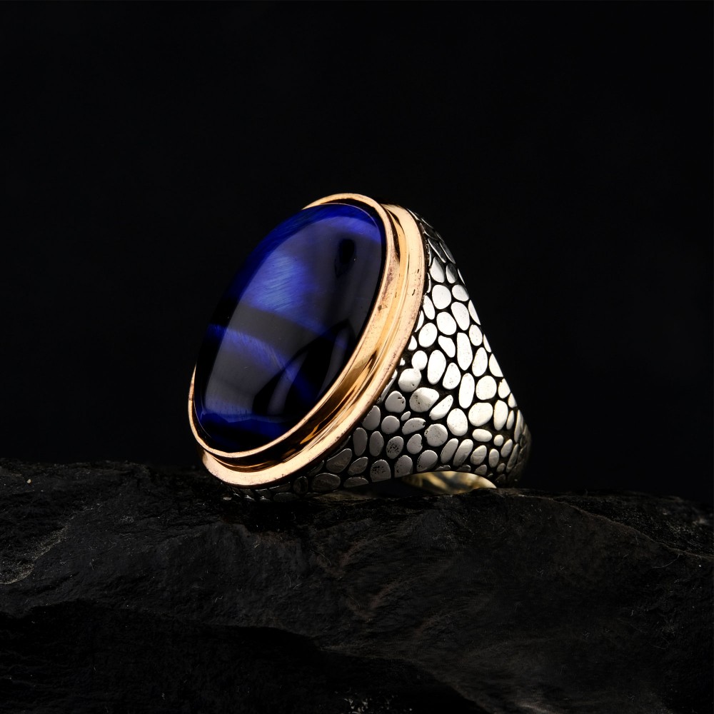 925 Ayar Gümüş Mavi Kaplan Gözü Taşlı Duvar Desenli Erkek Yüzük