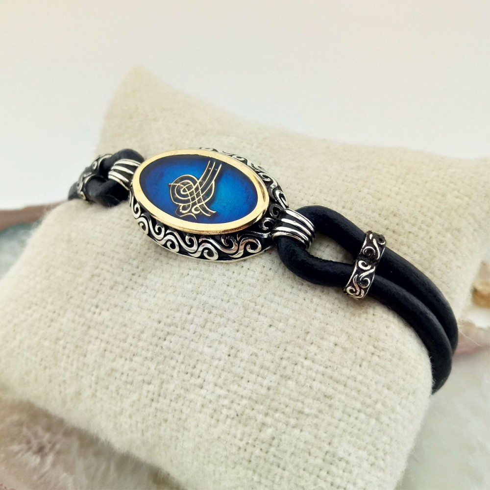 Mavi Mineli İşlemeli Osmanlı Tuğrası Gümüş Erkek Bileklik