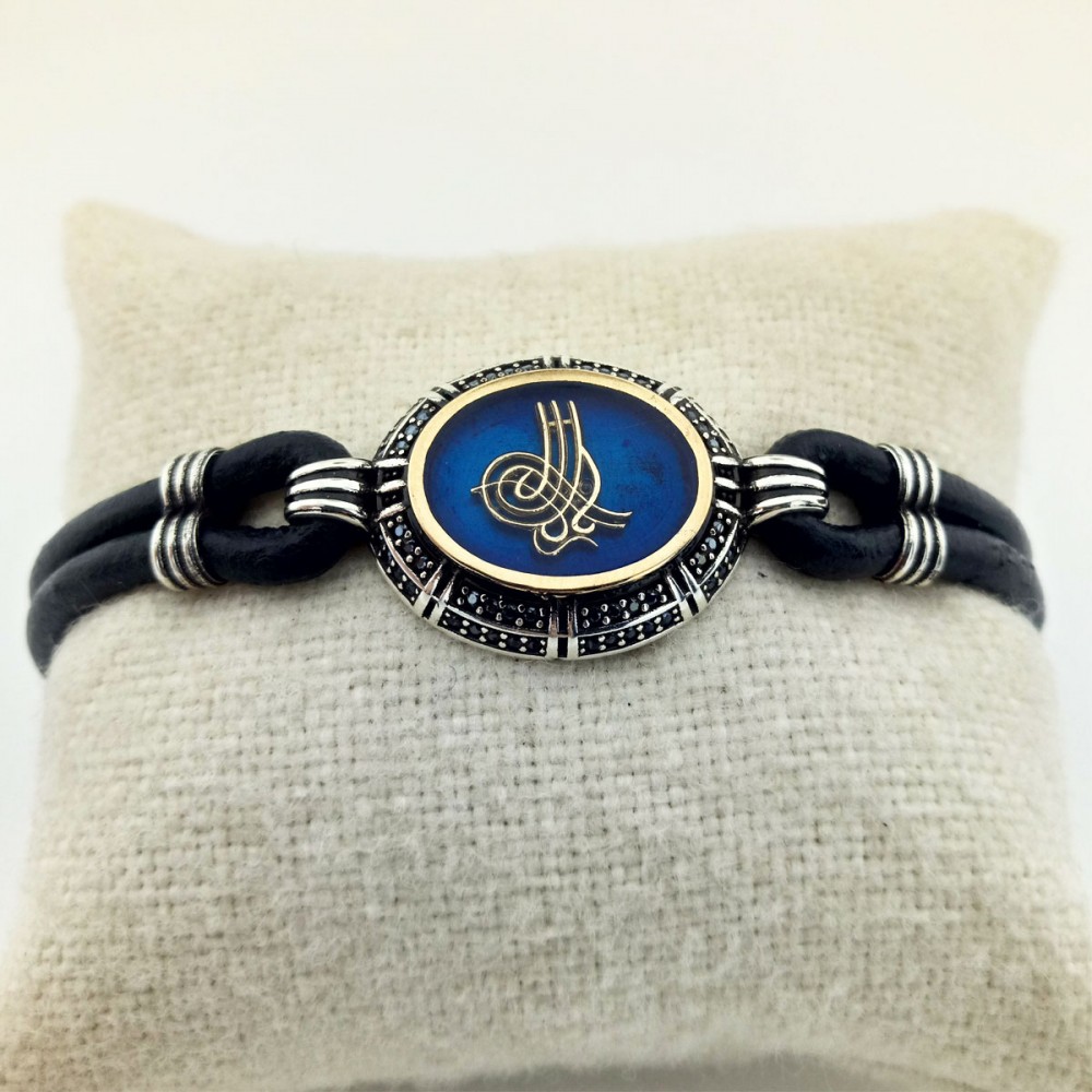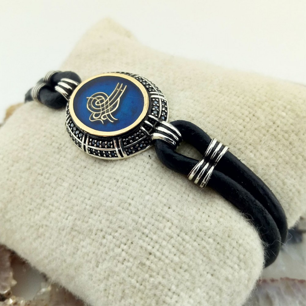 Mavi Mineli Siyah Zirkon Taşlı Osmanlı Tuğrası Gümüş Erkek Bileklik