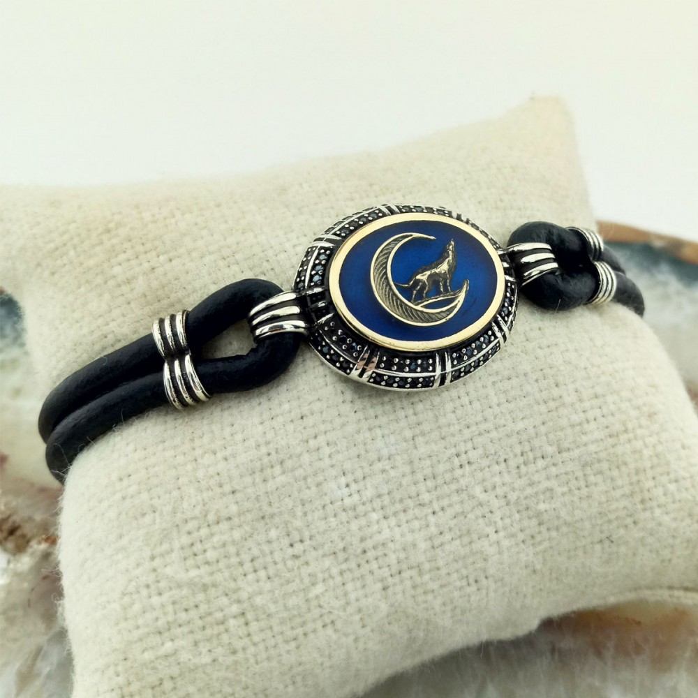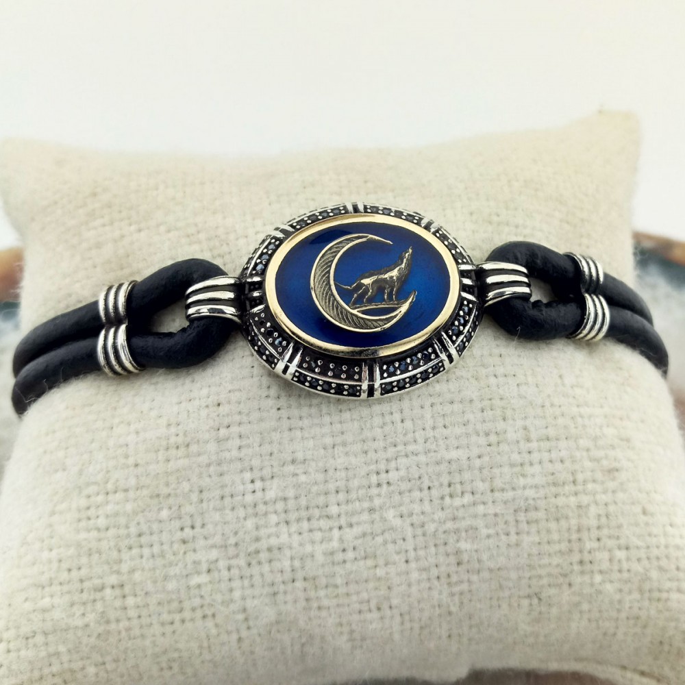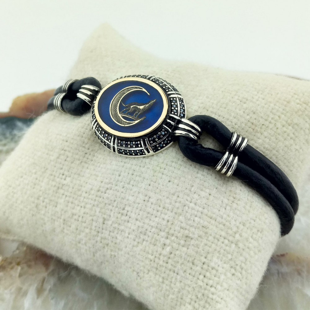 Mavi Mineli Siyah Zirkon Taşlı Hilal Bozkurt Gümüş Erkek Bileklik