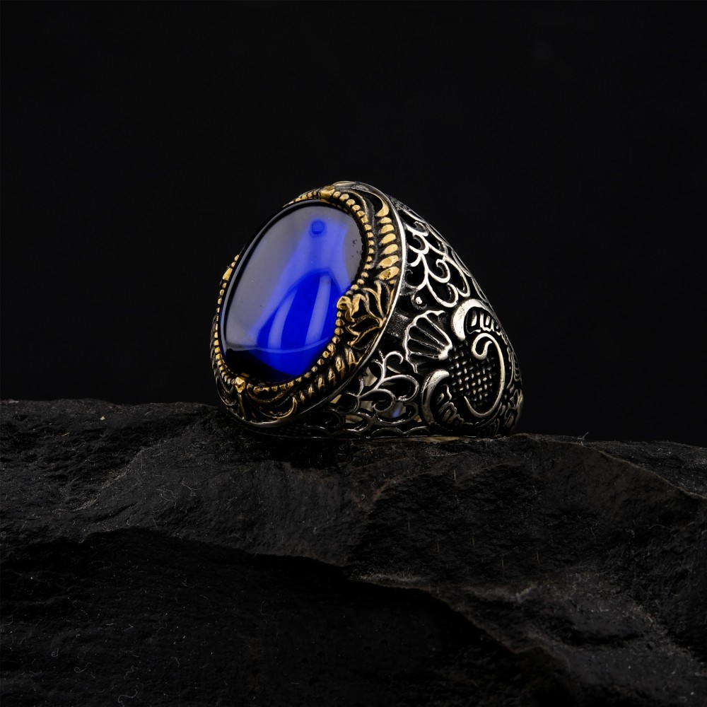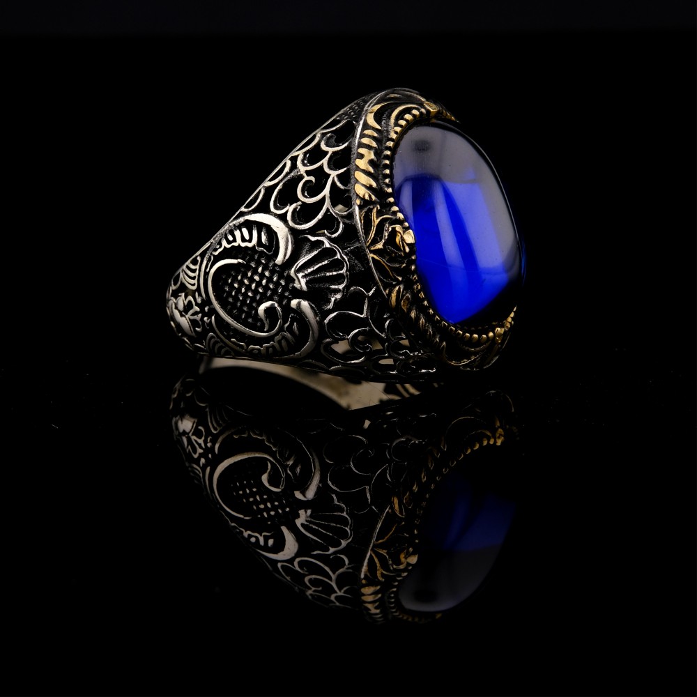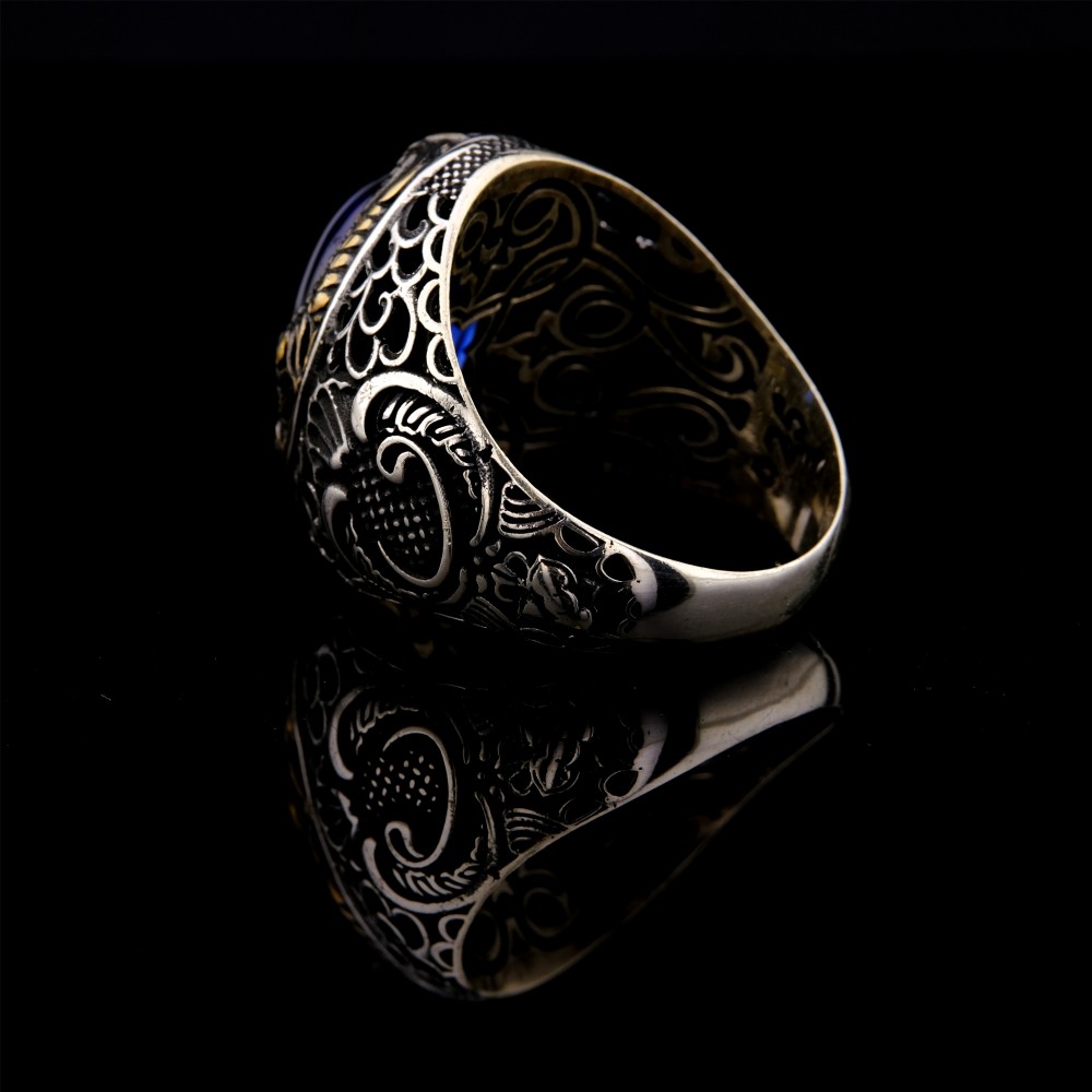 Göz alıcı tasarımıyla dikkat çeken bu 925 ayar gümüş yüzük, ortasında derin mavi zirkon taşıyla asil bir görünüm sunuyor. Yüzüğün yan kısımlarında yer alan Vav motifi, anlam yüklü bir detay olarak tasarımı zenginleştiriyor. Altın sarısı işlemeler, gümüş gövde ile uyum içinde olup yüzüğe klasik ve otantik bir hava katıyor. El işçiliği ile üretilmiş bu şık aksesuar, hem günlük kullanımda hem de özel günlerde tarzınıza güçlü bir imza atar.