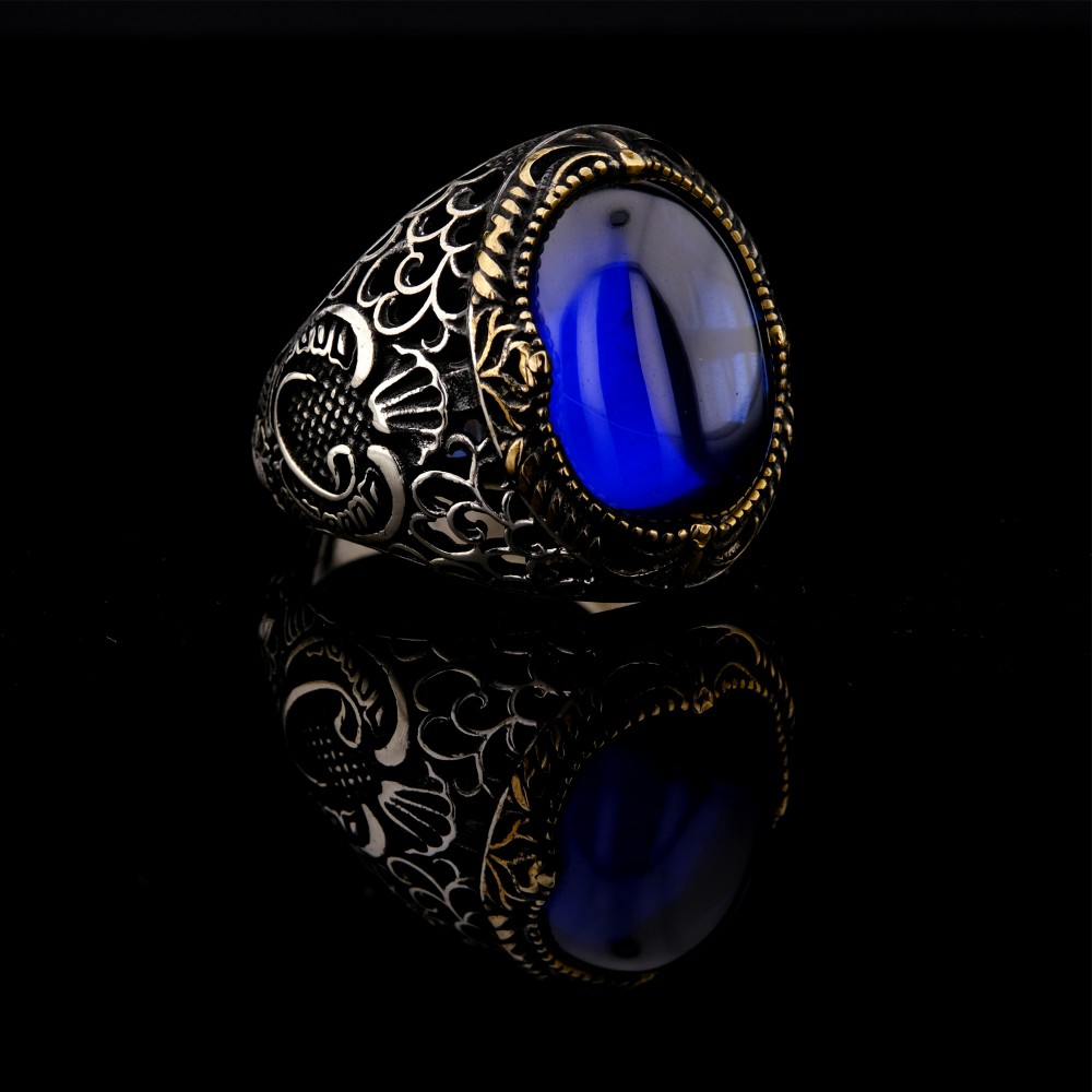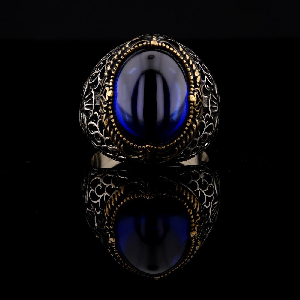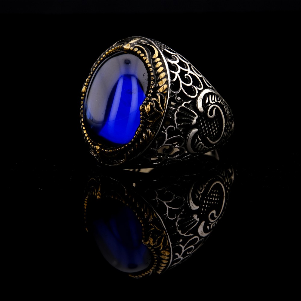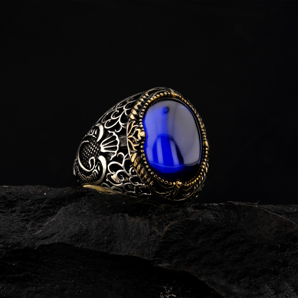 Göz alıcı tasarımıyla dikkat çeken bu 925 ayar gümüş yüzük, ortasında derin mavi zirkon taşıyla asil bir görünüm sunuyor. Yüzüğün yan kısımlarında yer alan Vav motifi, anlam yüklü bir detay olarak tasarımı zenginleştiriyor. Altın sarısı işlemeler, gümüş gövde ile uyum içinde olup yüzüğe klasik ve otantik bir hava katıyor. El işçiliği ile üretilmiş bu şık aksesuar, hem günlük kullanımda hem de özel günlerde tarzınıza güçlü bir imza atar.