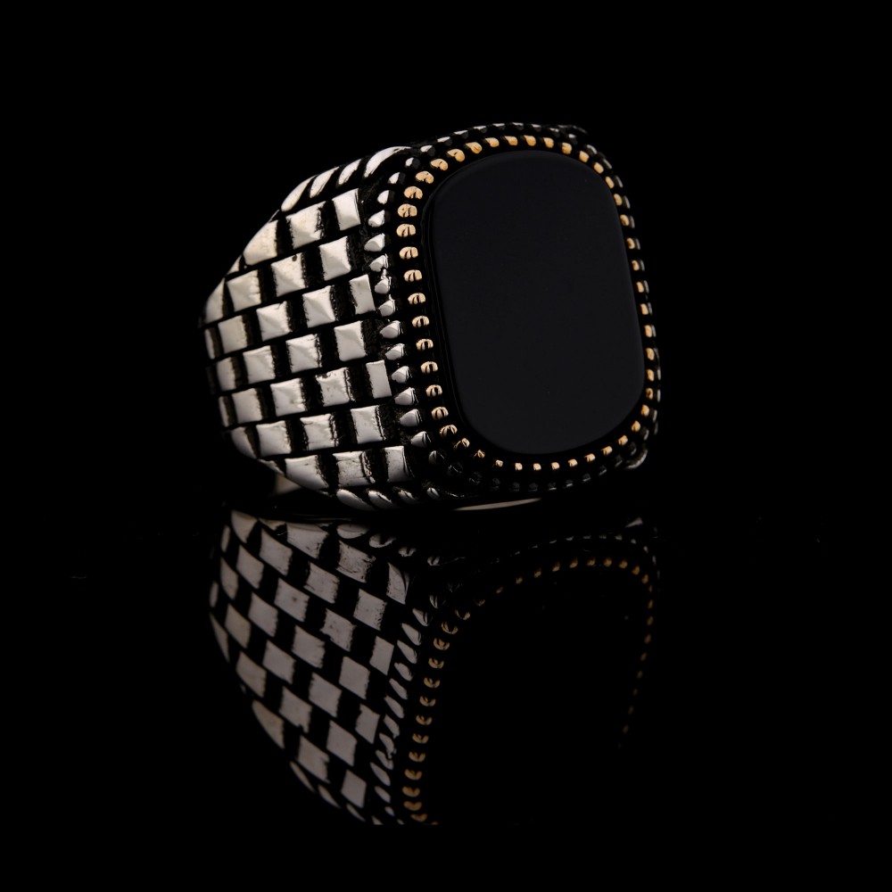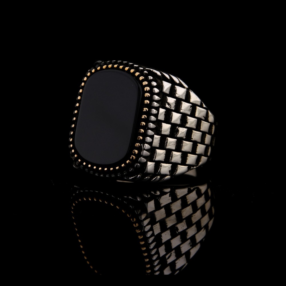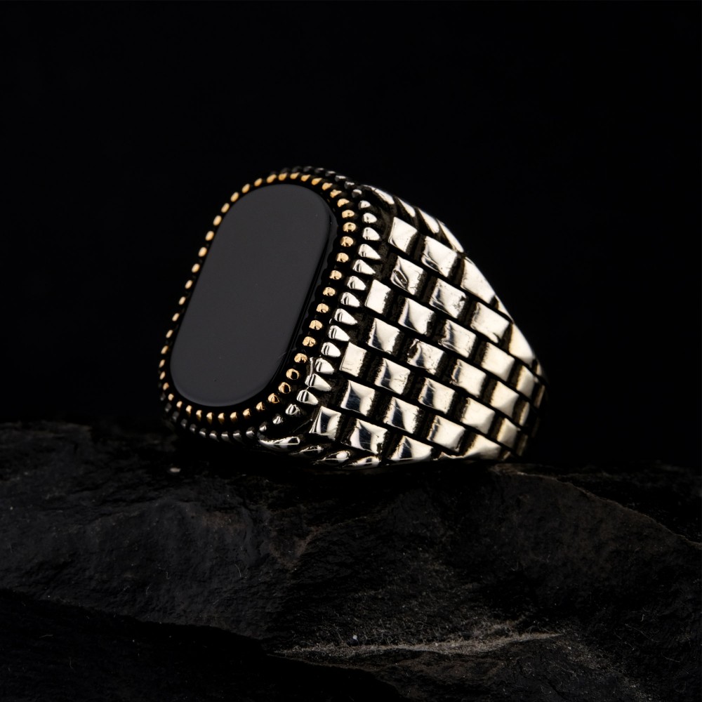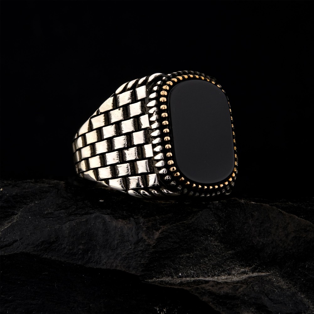 925 Ayar Gümüş Siyah Oniks Taşlı Saat Kordonu Desenli Erkek Yüzük – Modern Tasarım
