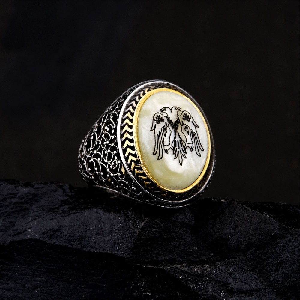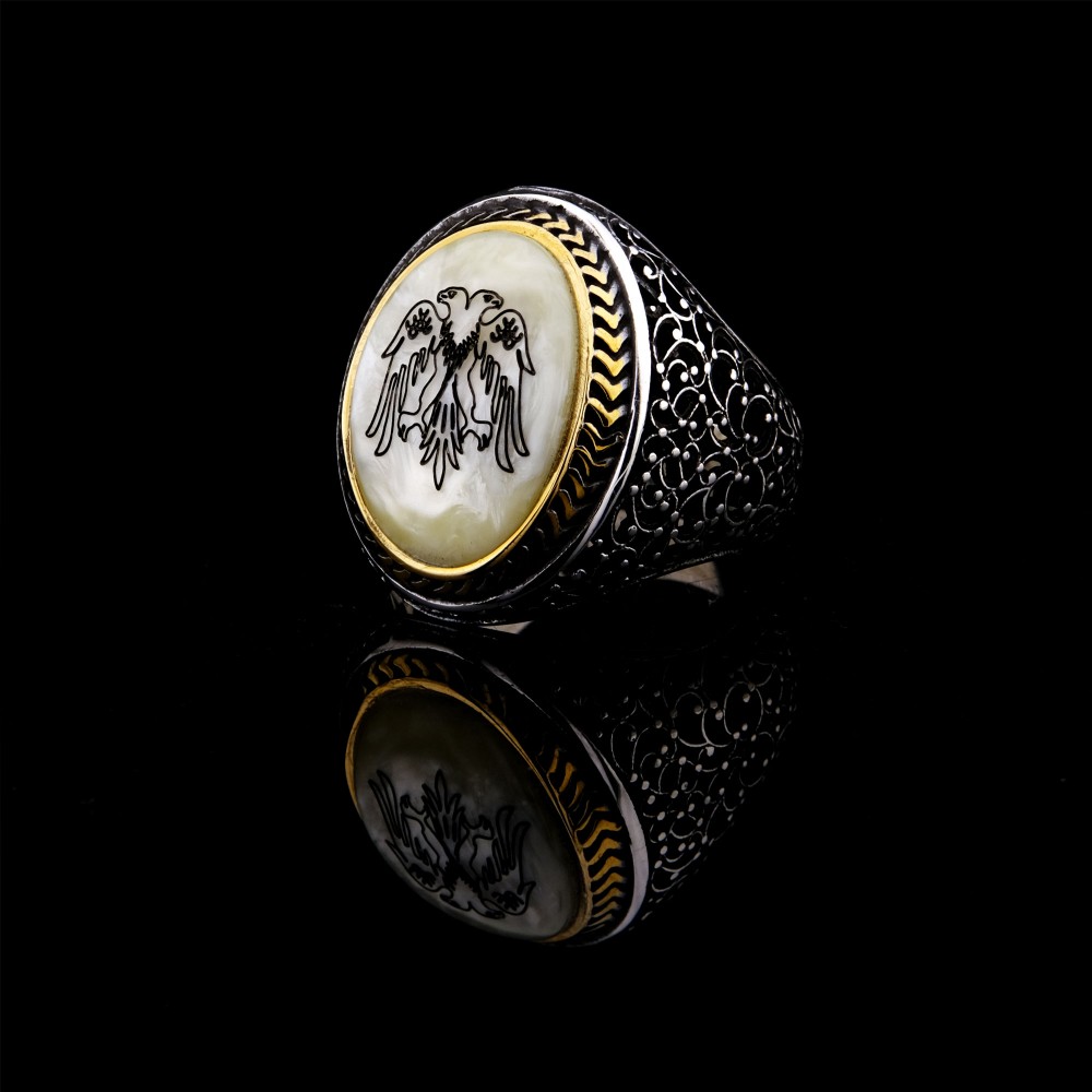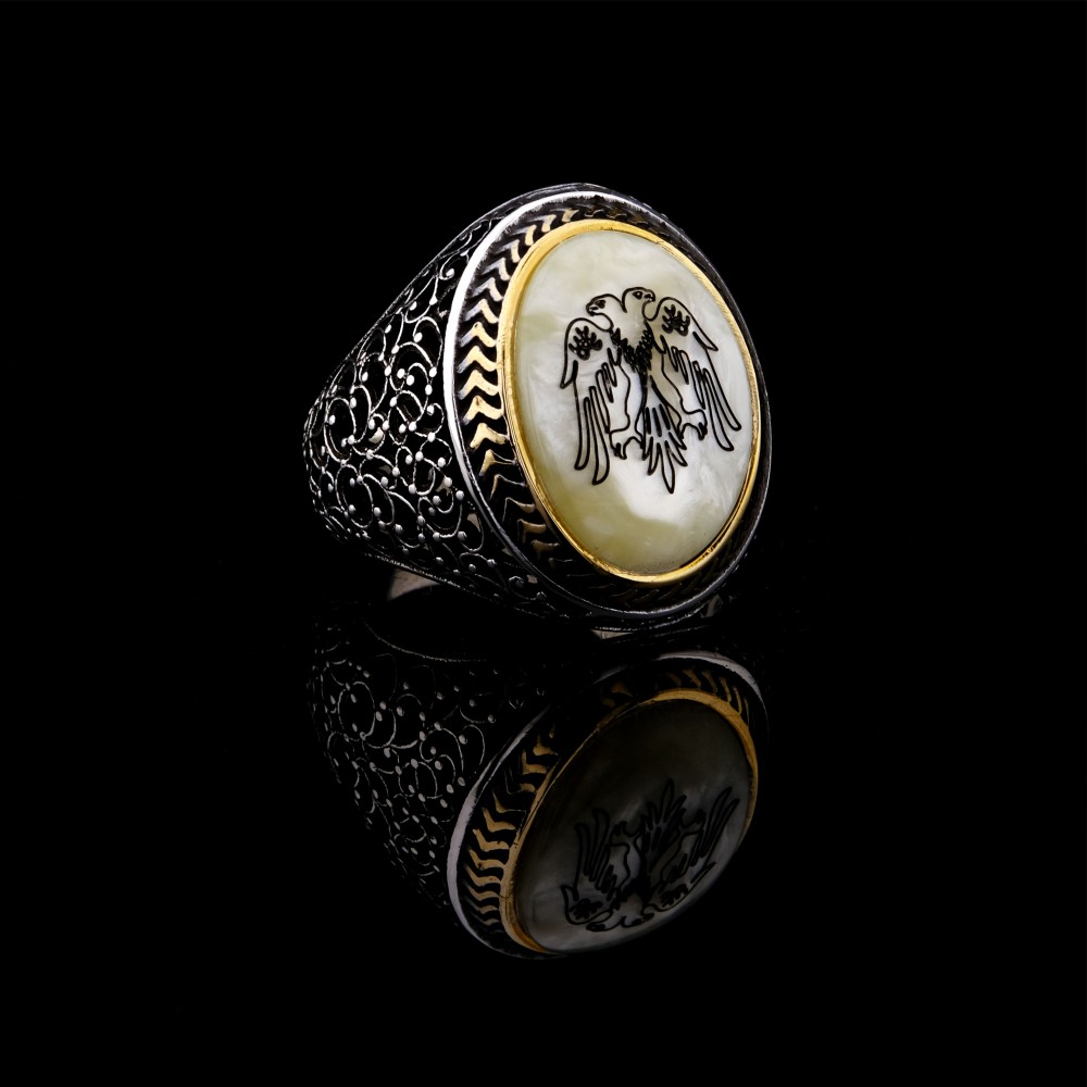 Tarihin ihtişamlı sembollerinden çift başlı Selçuklu kartalı, bu özel tasarım erkek yüzükte 925 ayar gümüş ve sedef taş ile buluşuyor. Yüzüğün merkezinde yer alan sedef taş üzerine işlenmiş Selçuklu kartalı, gücü, adaleti ve özgürlüğü simgelerken; yanlardaki el işçiliği motifler ve altın kaplama detaylar zarif bir görünüm sunuyor.