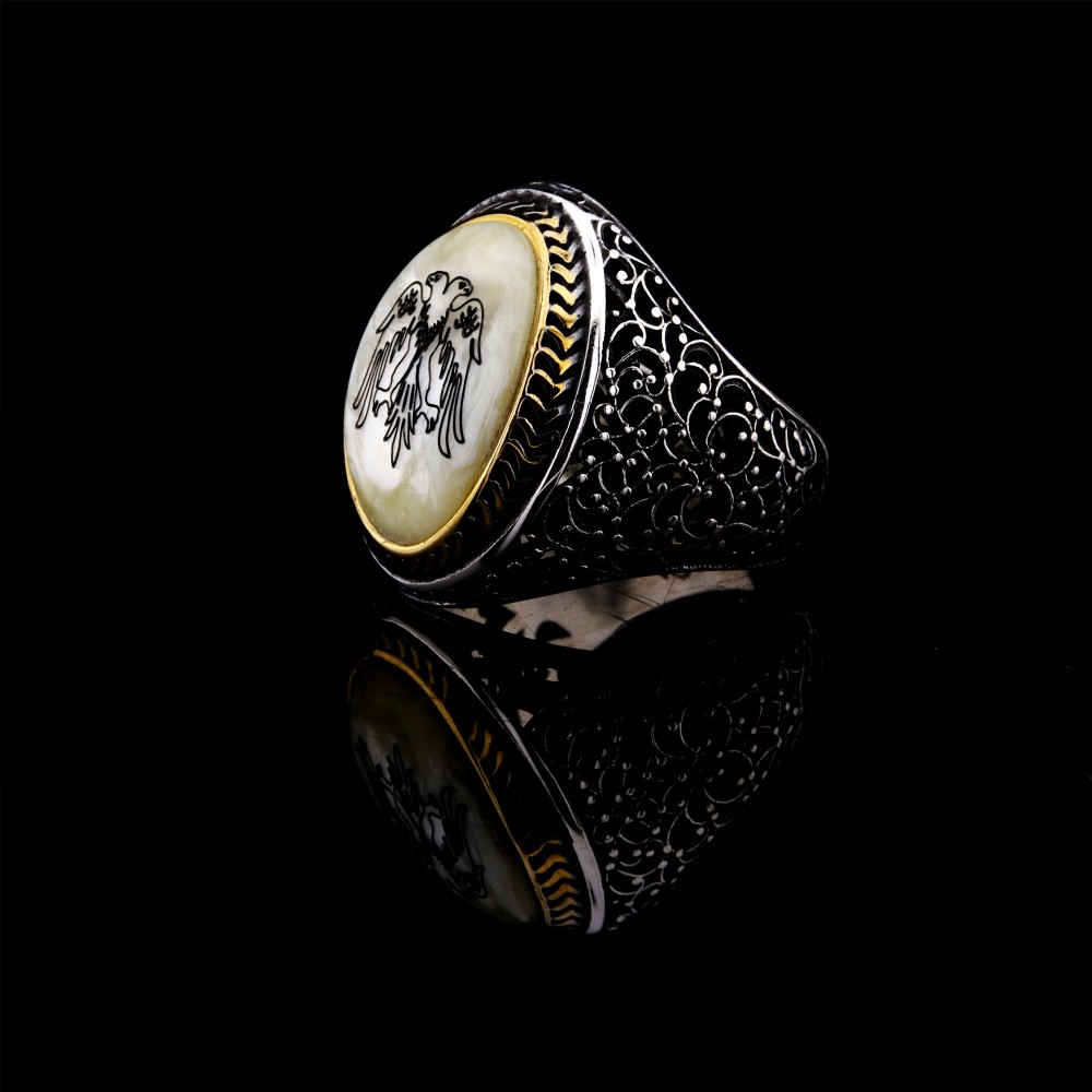 925 Ayar Gümüş Selçuklu Kartalı İşlemeli Sedef Taşlı Erkek Yüzük