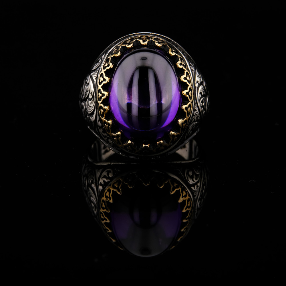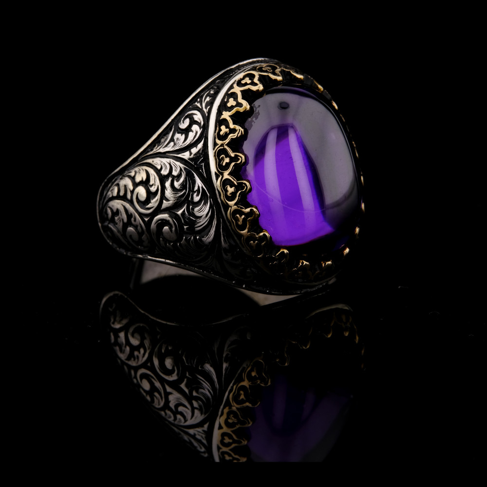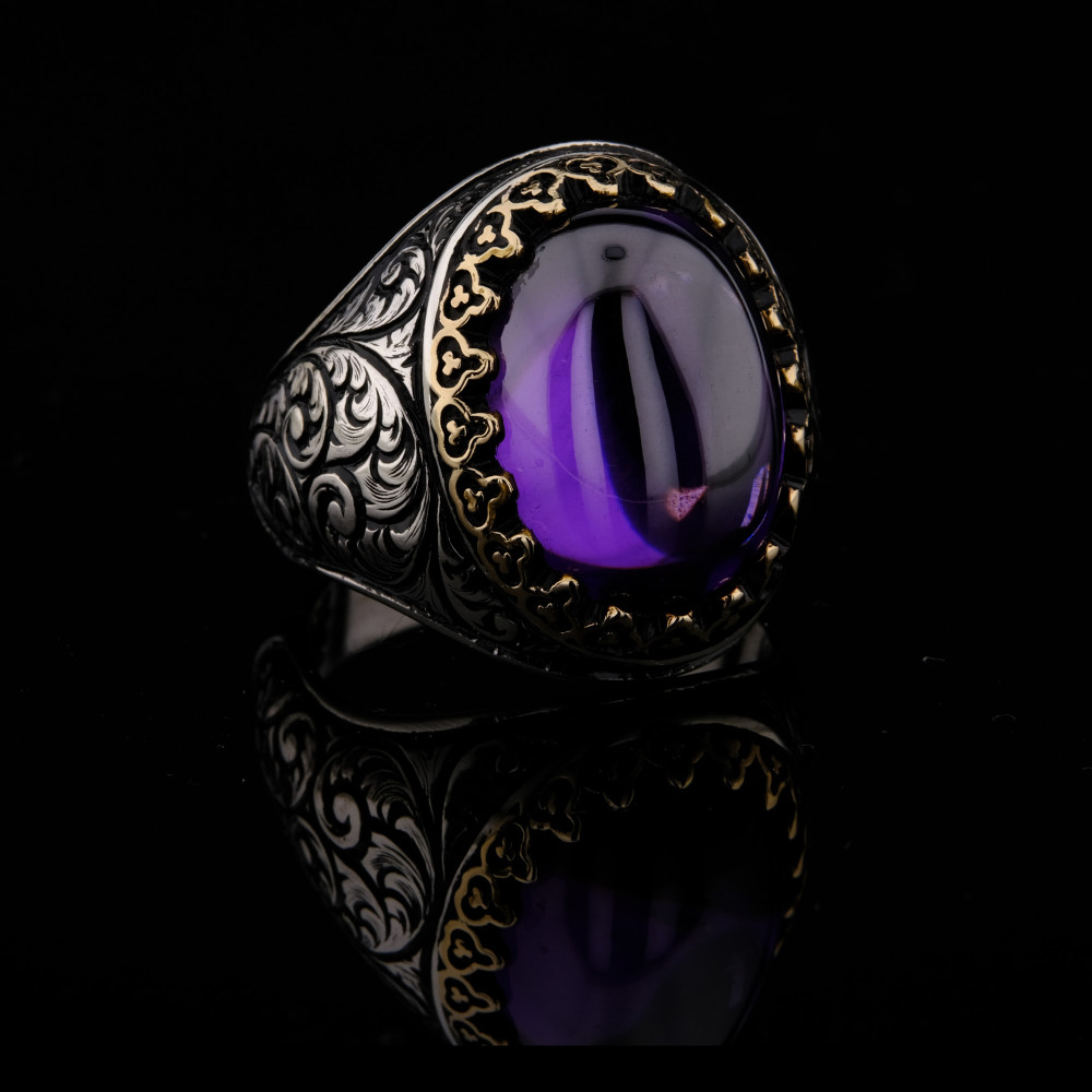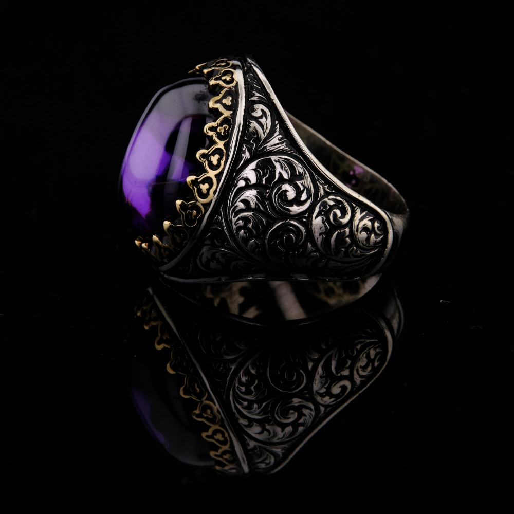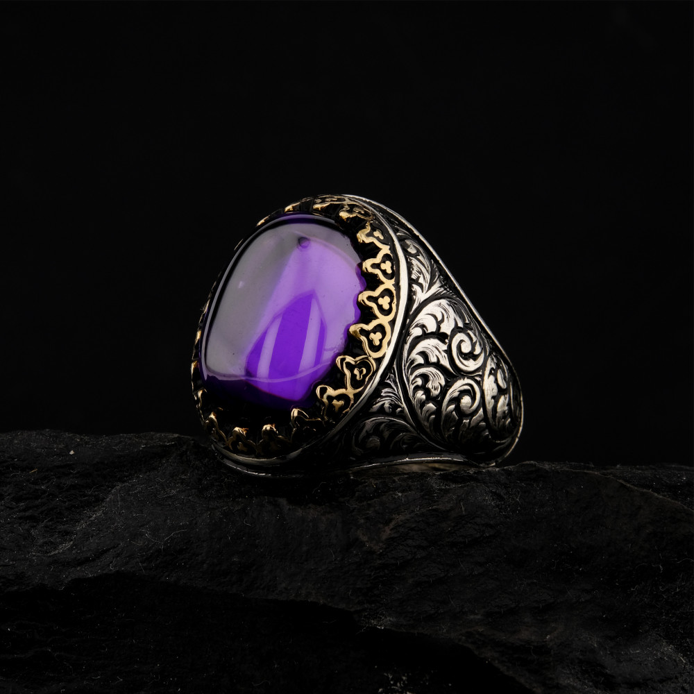 925 Ayar Gümüş Ametist Taşlı Erkek Yüzük – Sarmaşık Desenli Otantik Tasarım