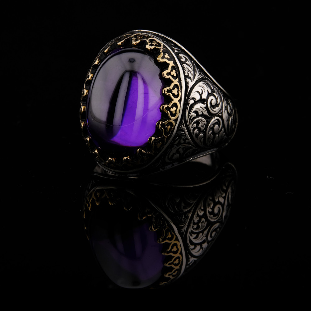 El işçiliğinin en güzel örneklerinden biri olan bu 925 ayar gümüş erkek yüzük, mor ametist taşının güçlü enerjisi ile tasarlanmıştır. Yüzüğün çevresindeki altın kaplama detaylar ve sarmaşık motifli desenler, yüzüğe asil ve zarif bir görünüm kazandırır. Hem klasik hem de otantik tarzı yansıtan bu özel yüzük, günlük kullanımda şıklığınızı tamamlayacağı gibi özel günlerde de dikkat çeken bir aksesuar olacaktır. Ametist taşı, tarih boyunca huzur, denge ve koruma sembolü olarak kabul edilmiştir. Koleksiyonunuza değer katacak bu tasarım, aynı zamanda sevdiklerinize de anlamlı ve şık bir hediye alternatifidir.