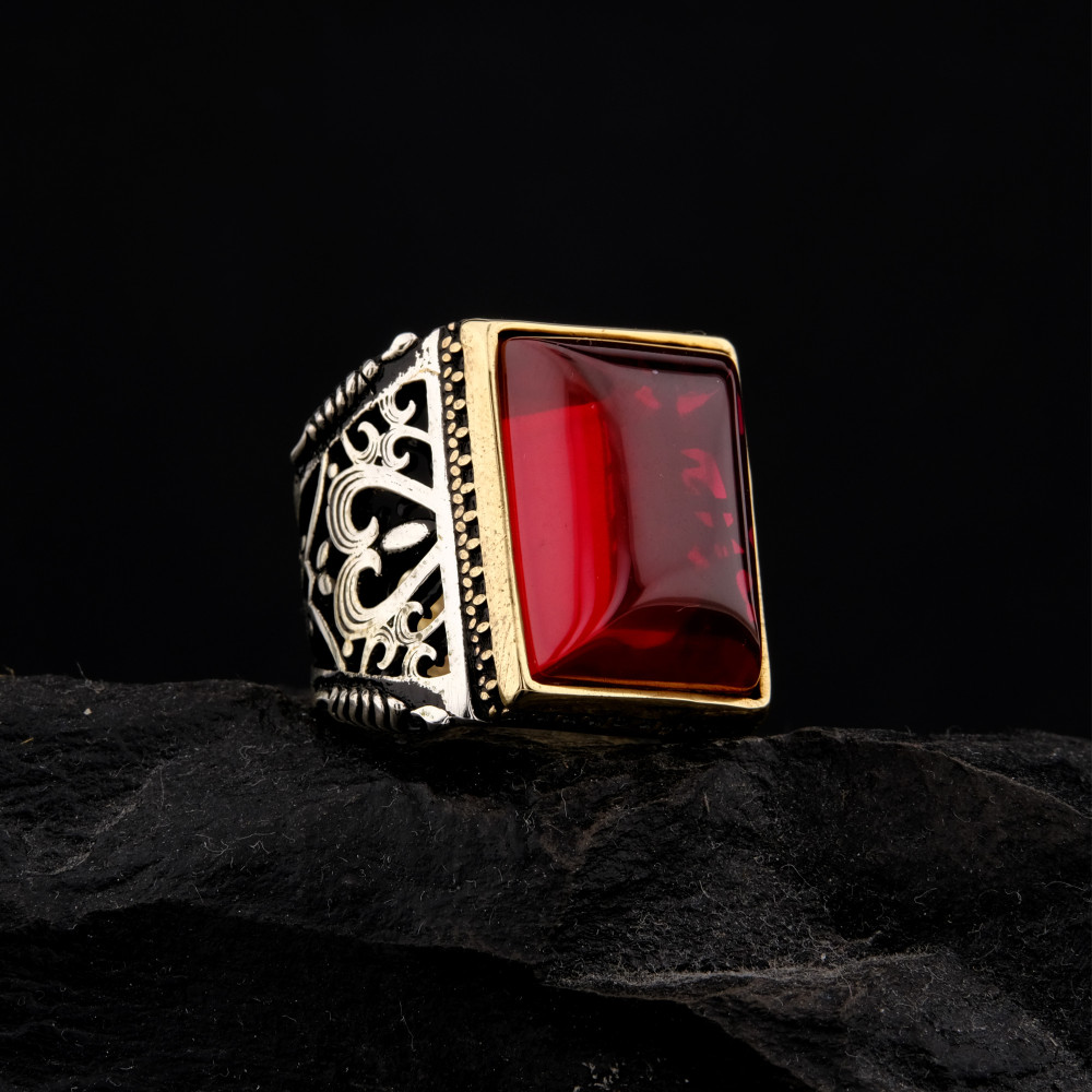 925 Ayar Gümüş Kırmızı Lal Taşlı Erkek Yüzük – Osmanlı Motifli Büyük Tasarım