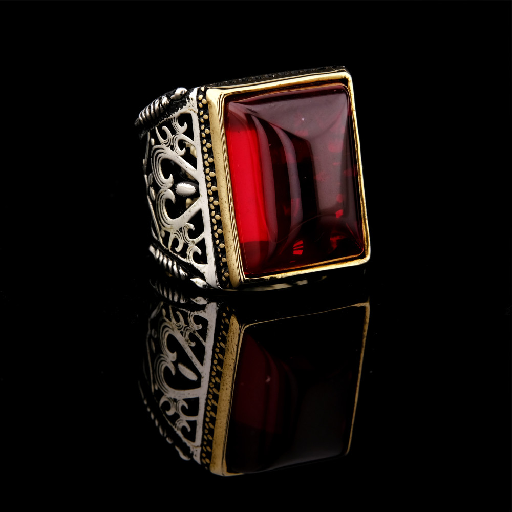 Şıklığı ve ihtişamı bir arada sunan bu 925 ayar gümüş erkek yüzük, merkezinde yer alan kırmızı lal taşı ile güçlü bir duruş sergiler. Osmanlı motifli detaylı işçiliği ve altın kaplama çerçevesiyle geleneksel zarafeti modern tasarımla buluşturur.