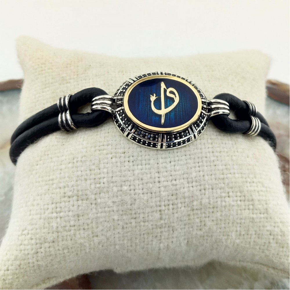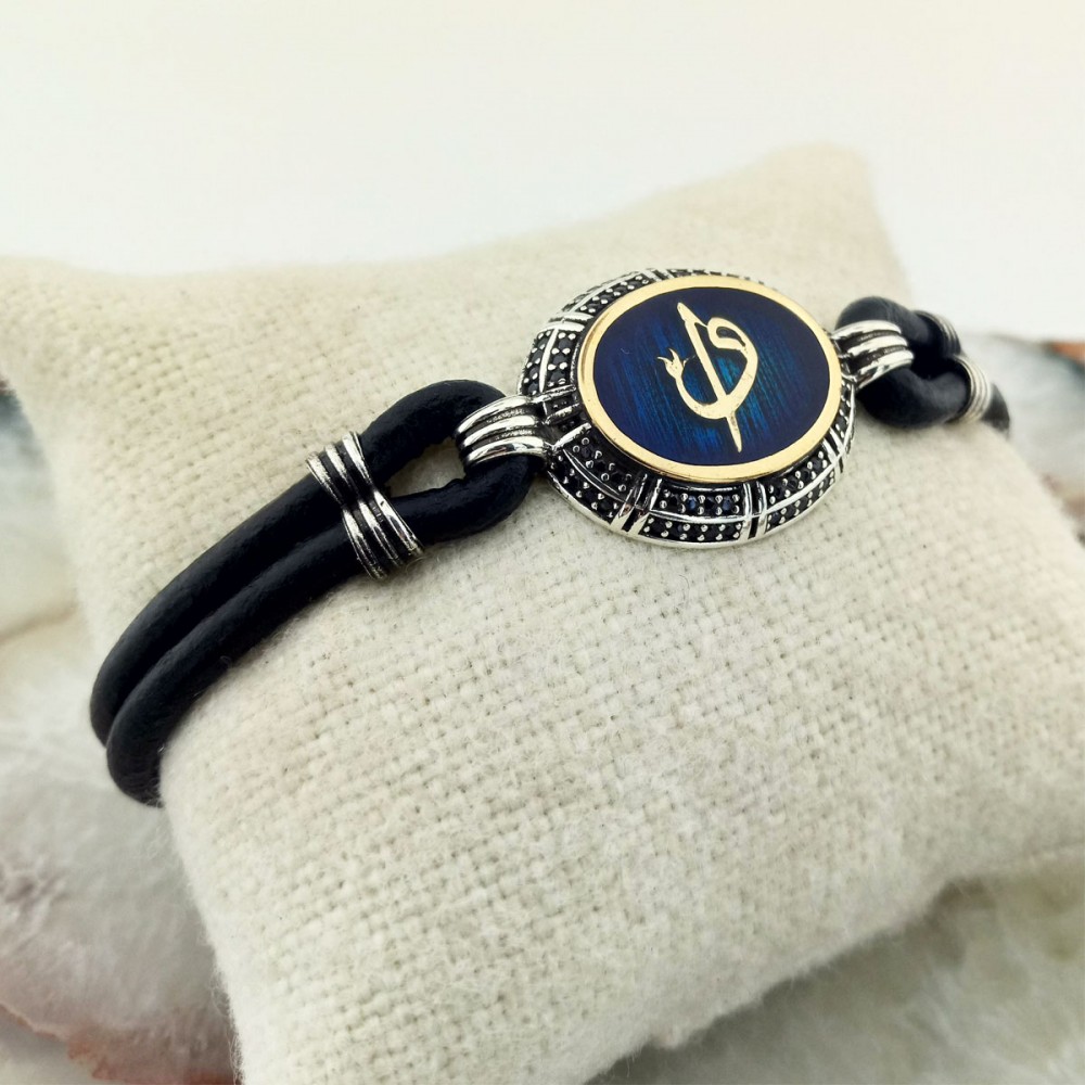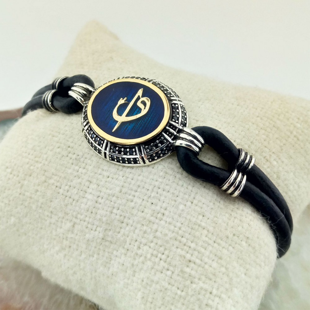 Mavi Mineli Siyah Zirkon Taşlı Elif Vav Gümüş Erkek Bileklik