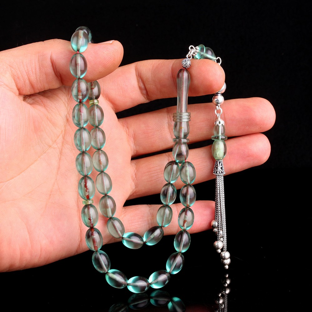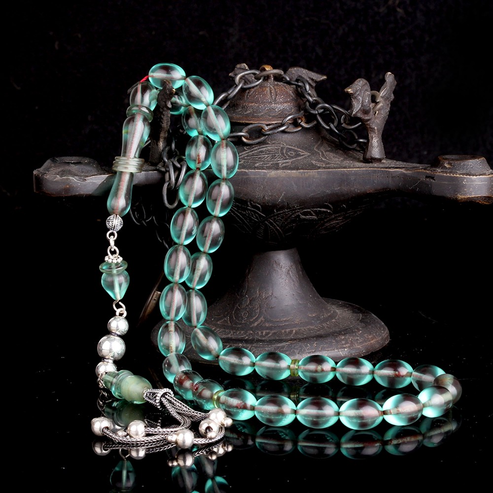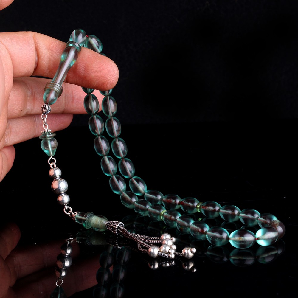 925 Ayar Gümüş Mineli Püsküllü Su Yeşili Ateş Kehribar Tesbih