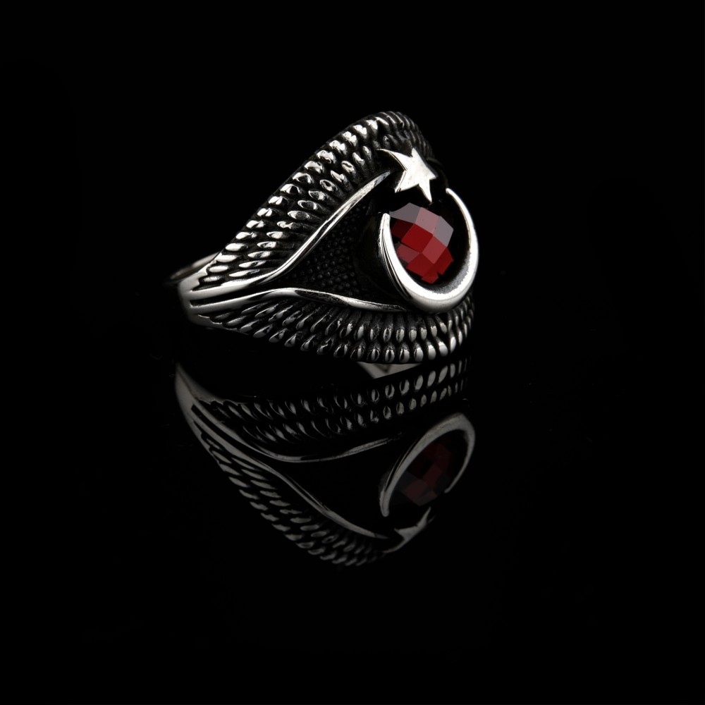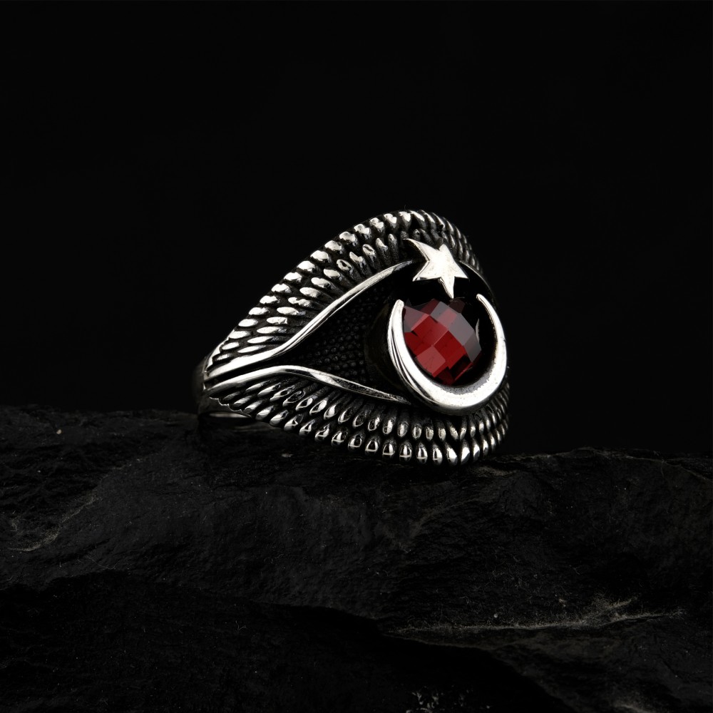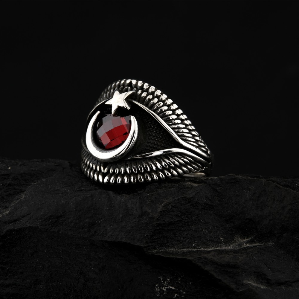 Ay Yıldız Motifli Kırmızı Zirkon Taşlı Gümüş Erkek Yüzük