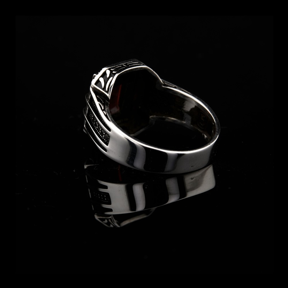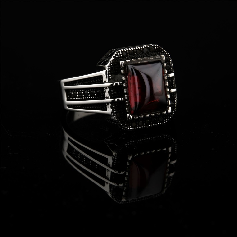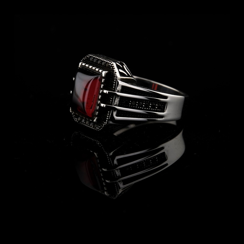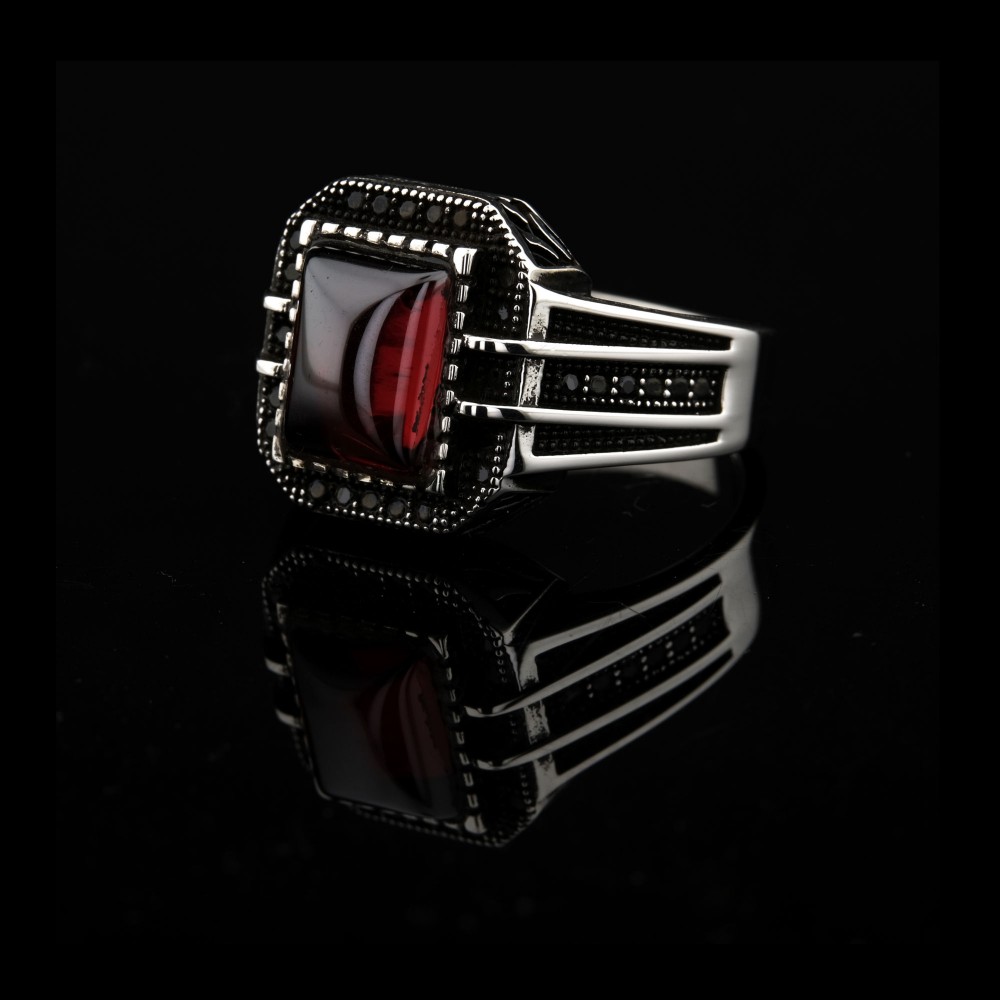 Tasarım: Merkezi kare formda, bordo/kırmızı renkte doğal akik taşı; etrafında ve yüzük kolunda siyah zirkon taş işlemeleriyle bezeli, modern ve geleneksel motifleri harmanlayan özel bir tasarım.