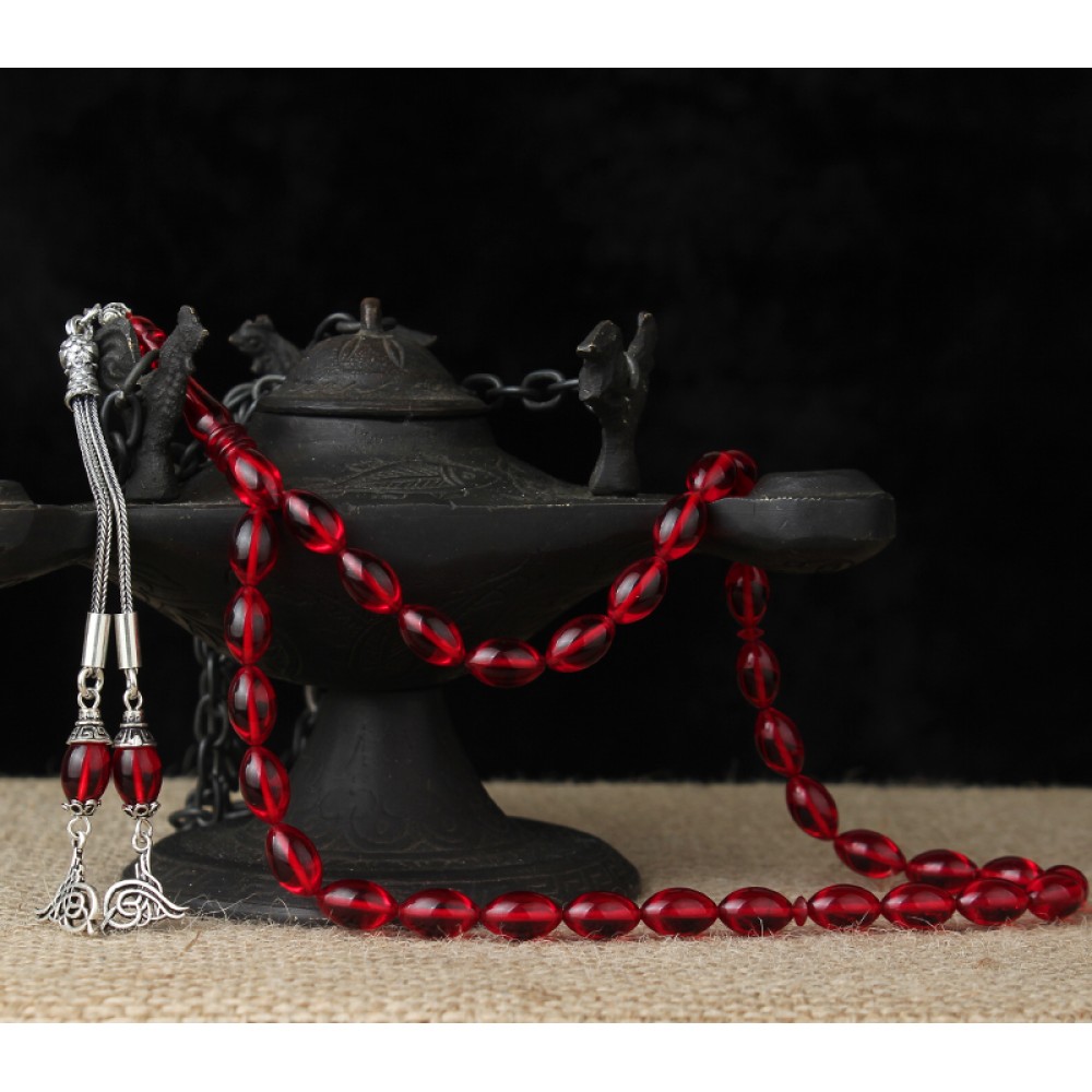 GÜMÜŞ TUĞRA PÜSKÜLLÜ KIRMIZI SIKMA KEHRİBAR TESBİH