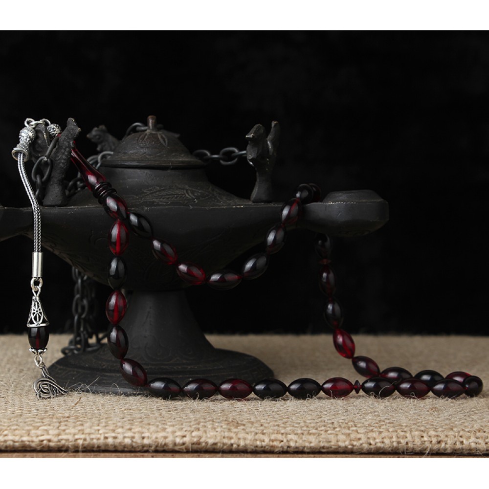 GÜMÜŞ TUĞRAPÜSKÜLLÜ KIRMIZI SİYAH SIKMA KEHRİBAR TESBİH