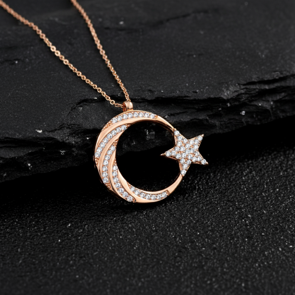 925 Ayar Gümüş Rose Renk Zirkon Taşlı Ay Yıldız Gümüş Kolye