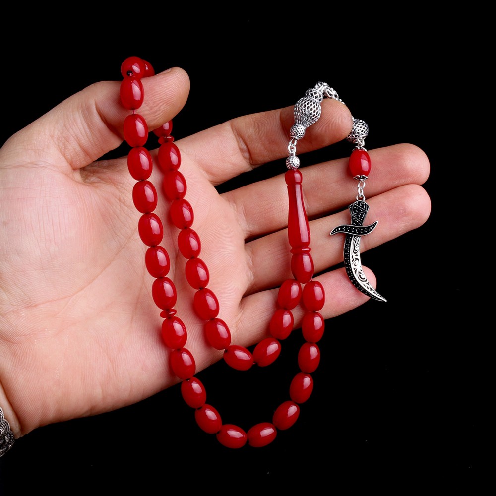 925 Ayar Gümüş Püsküllü Hz Ali Model Bordo Renk Ateş Kehribar Tesbih