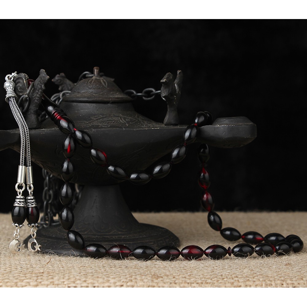 GÜMÜŞ AYYILDIZ PÜSKÜLLÜ KIRMIZI SİYAH SIKMA KEHRİBAR TESBİH