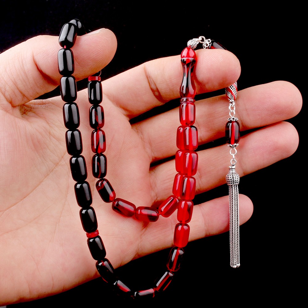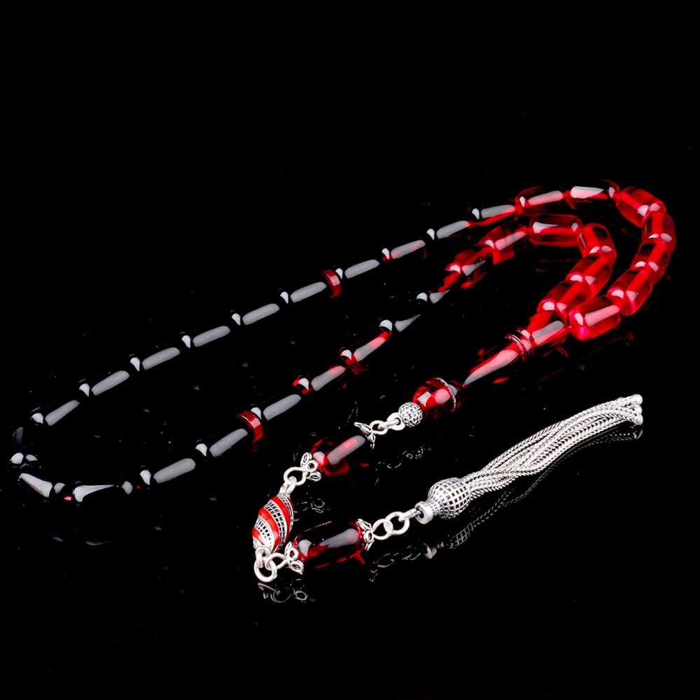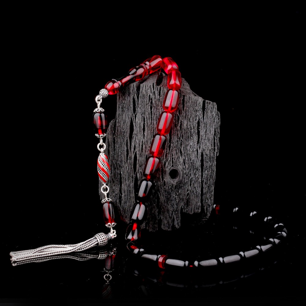 Süzme Renk Kapsül Kesim 925 Ayar Gümüş Mineli Püsküllü Ateş Kehribar Tesbih