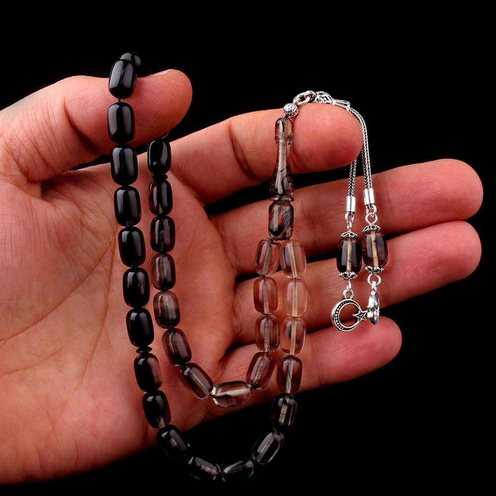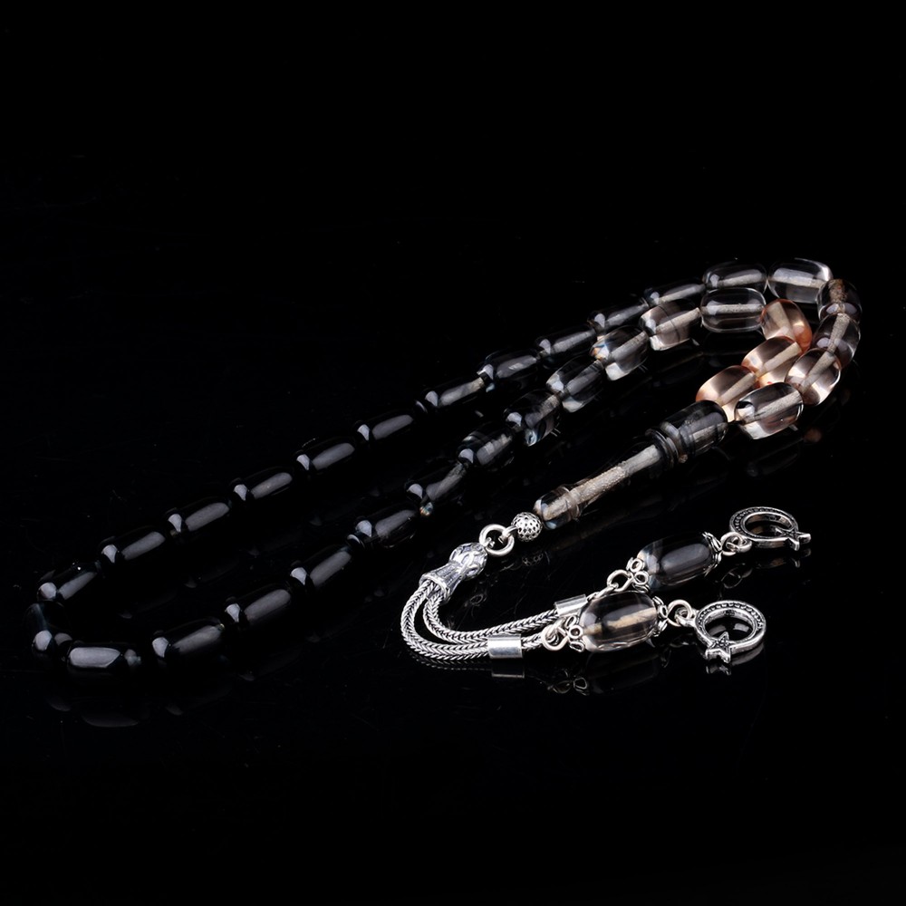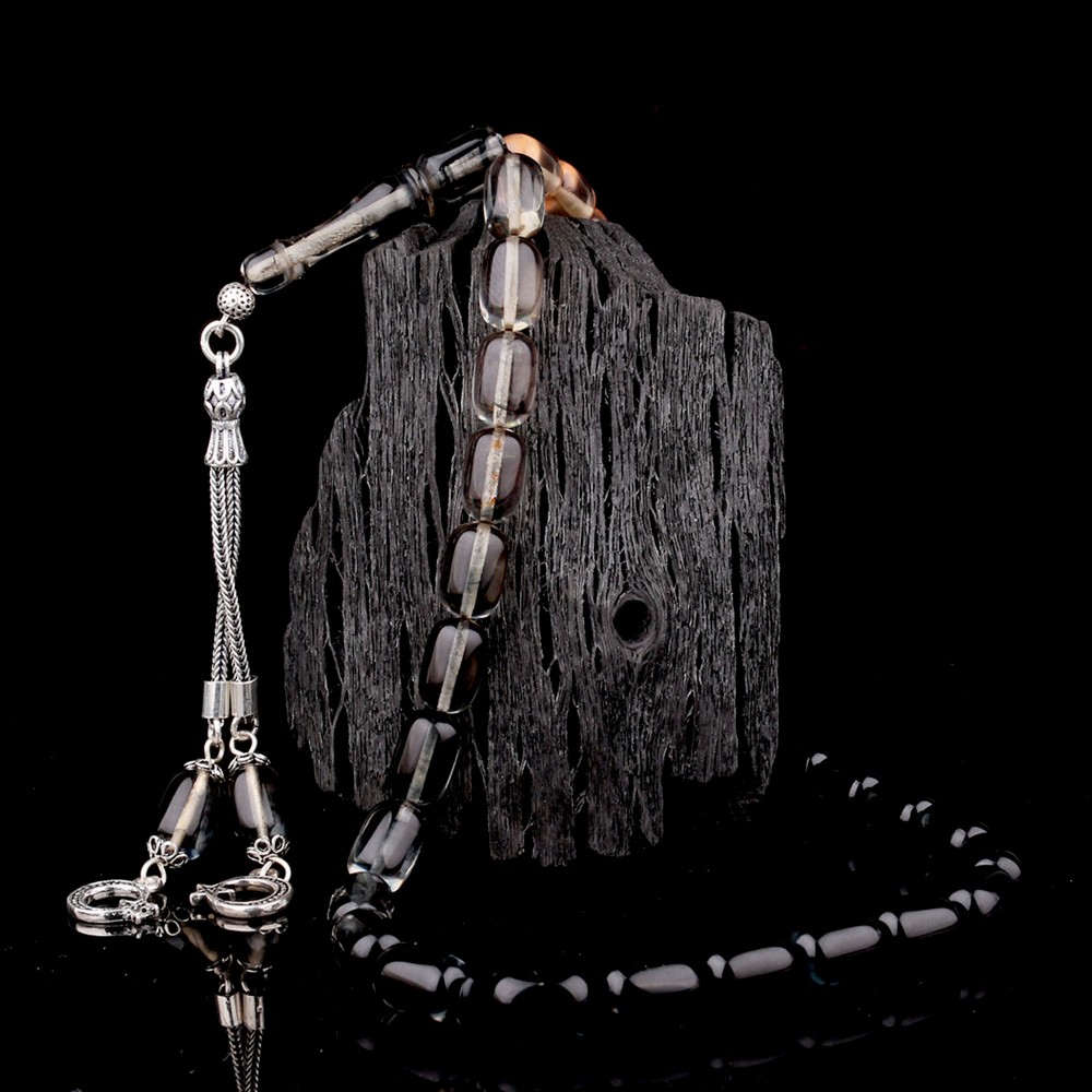 Süzme Renk Kapsül Kesim 925 Ayar Gümüş Püsküllü Ateş Kehribar Tesbih