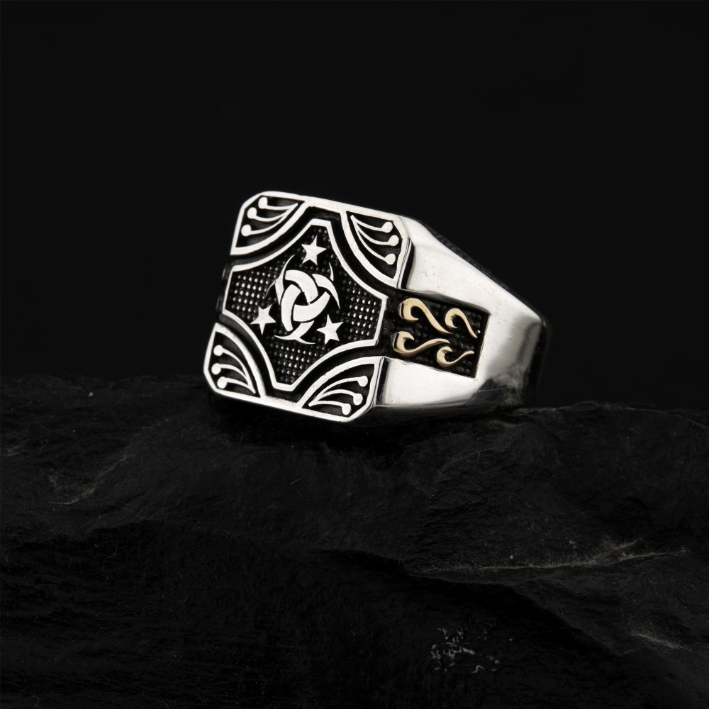 Bu özel tasarım erkek yüzüğü, antik sembollerin gücünü ve modern estetiği bir araya getiriyor. Merkezindeki güçlü Valknut benzeri üçlü düğüm motifi, karmaşık birliği ve kaderi temsil ederken, etrafındaki yıldızlar rehberliği ve umudu simgeliyor. Yan kısımlarındaki altın renkli zarif işlemelerle zenginleştirilen bu gümüş yüzük, her erkeğin kendine özgü tarzını yansıtan, derin anlamlar taşıyan güçlü bir ifade parçasıdır. Geleneksel motiflerin çağdaş bir yorumuyla, bu yüzük hem tarihsel derinliği hem de karizmatik duruşu bir araya getiriyor.