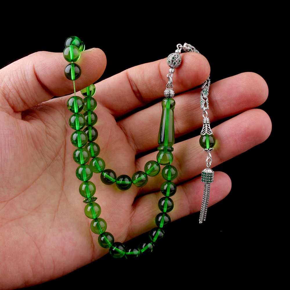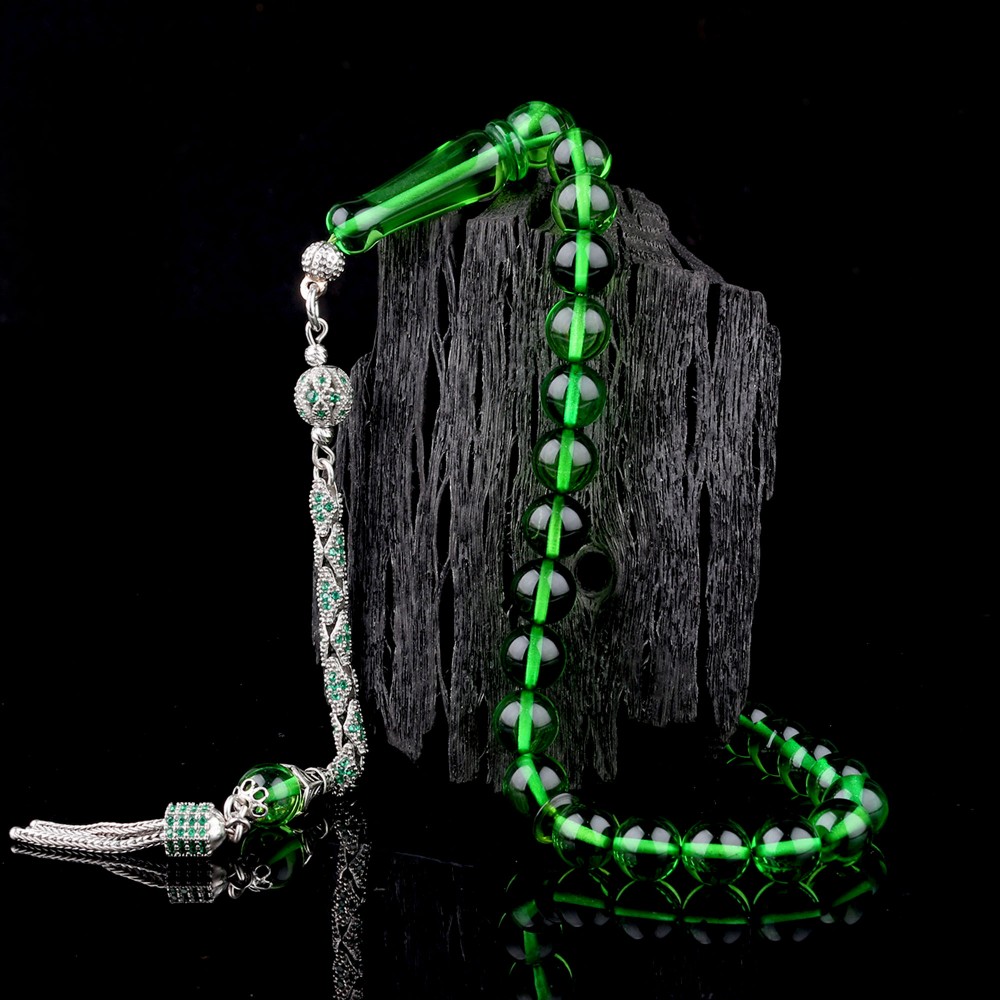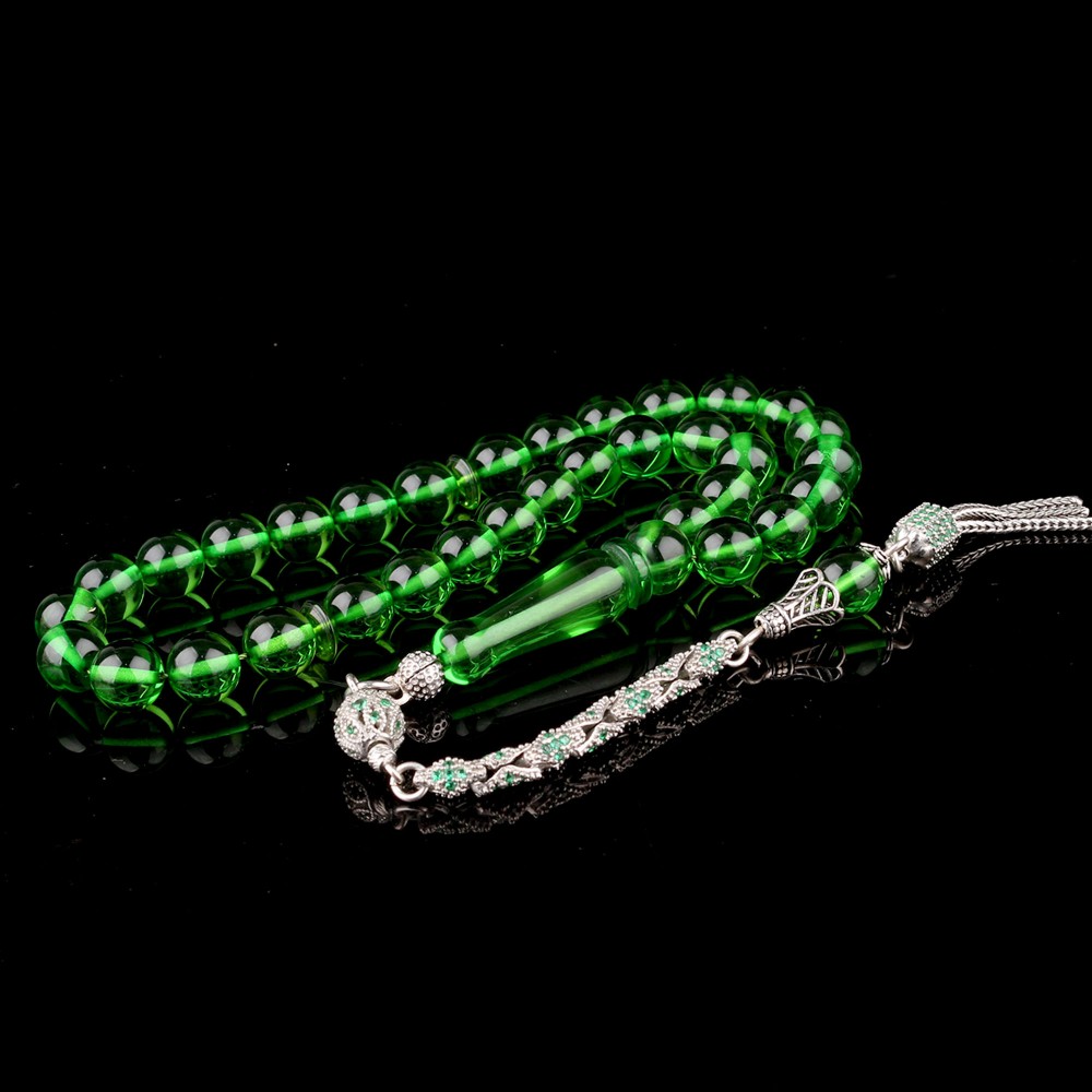 Yeşil Renk Damla Kehribar Tesbih Zirkon Taşlı Gümüş Püsküllü
